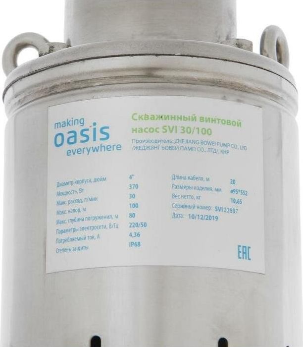 Мощность, Вт 370. Макс. расход, л/мин 30. Макс. напор, м 100. Макс. глубина погружения, м 80. Макс. допускаемая концентрация твердых частиц в воде, г/м3 300. Макс. размер пропускаемых частиц, мм 0,5. Материал корпуса Нержавеющая сталь. Тип двигателя Маслозаполненный двигатель. Длина кабеля 20. Диаметр изделия, мм 96.