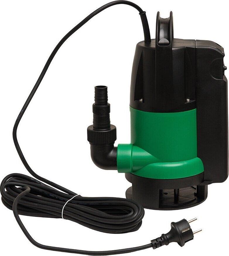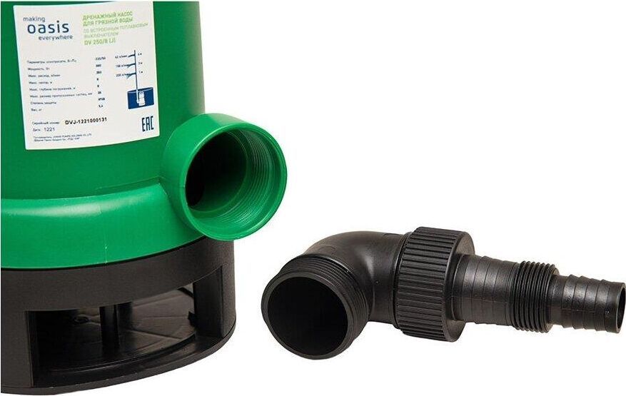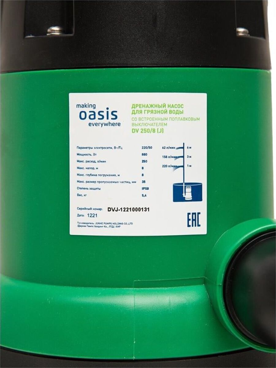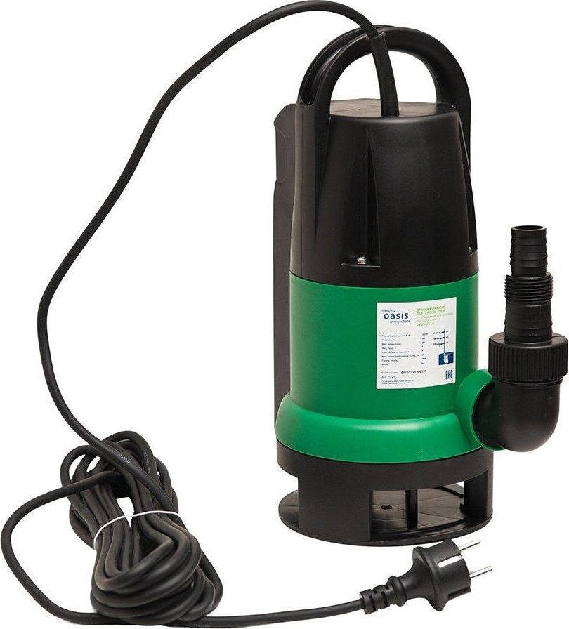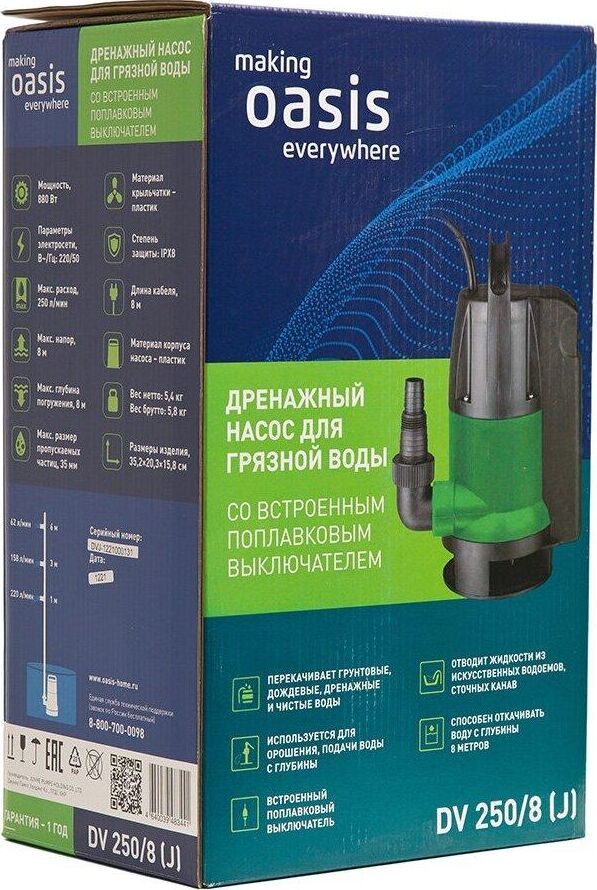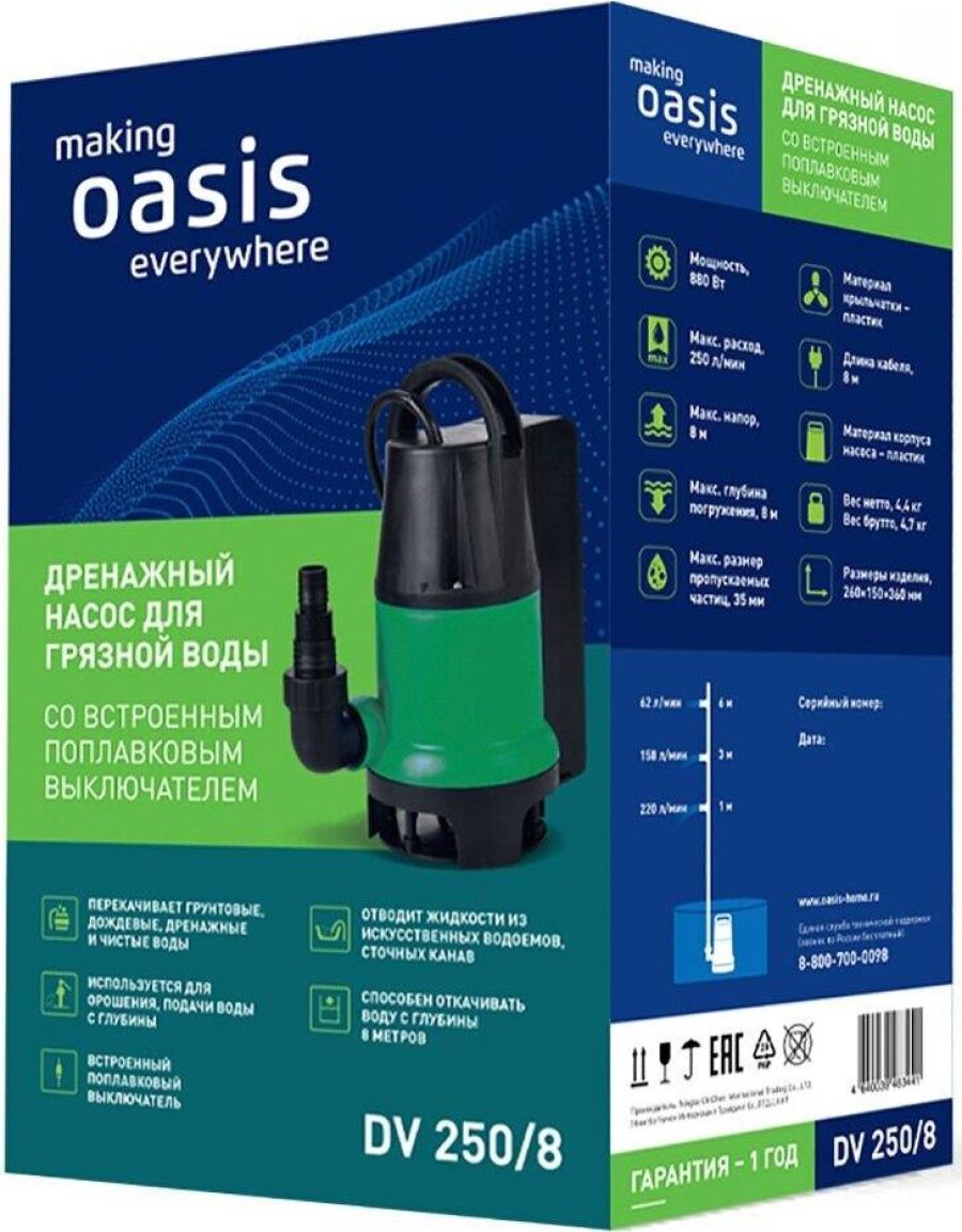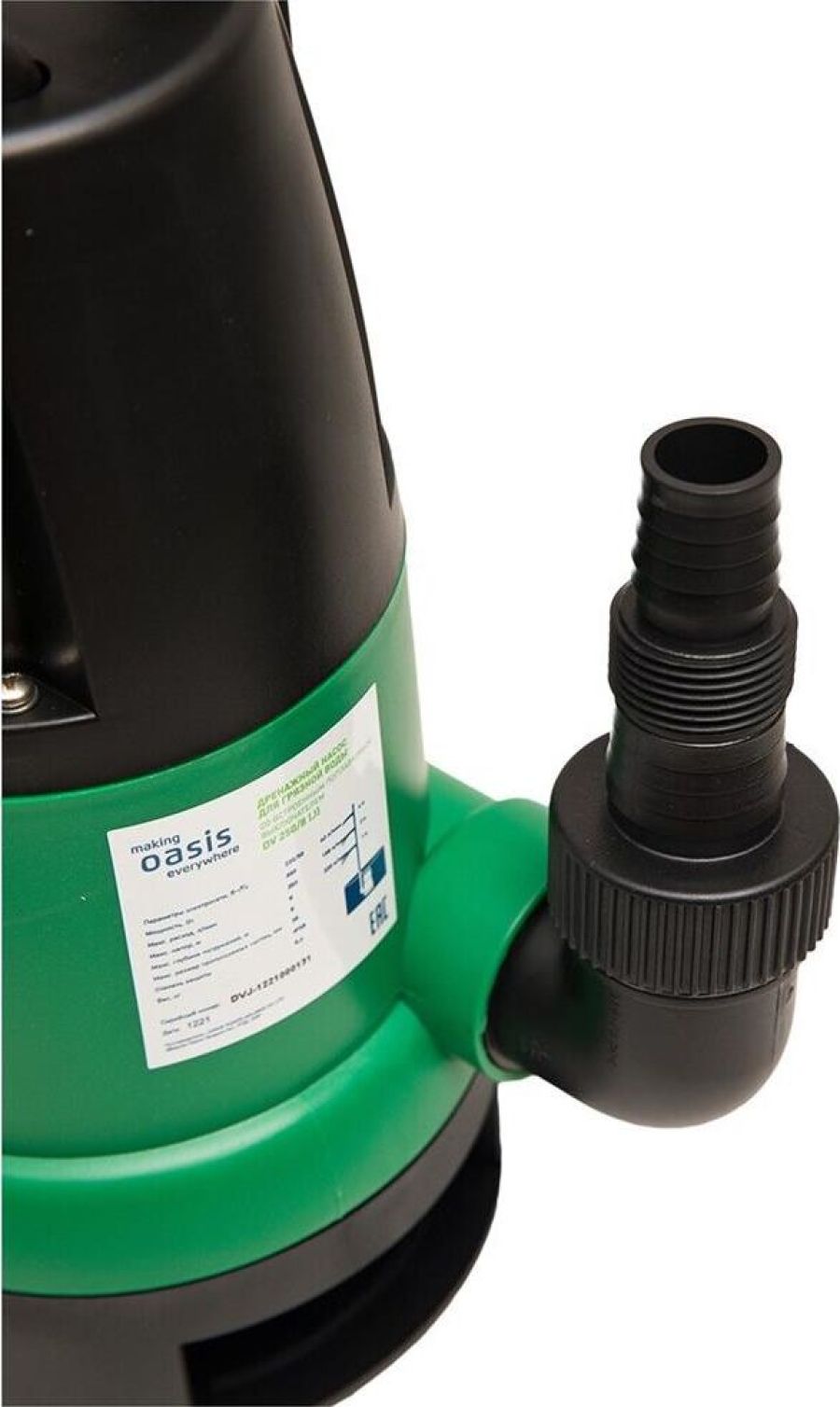 Насос дренажный для грязной воды, мощность 880 Вт, максимальный напор 8 метров, максимальный расход 250 л/мин, максимальный размер пропускаемых частиц 35 мм, максимальная глубина погружения 8 метров, материал корпуса пластик, встроенный поплавок