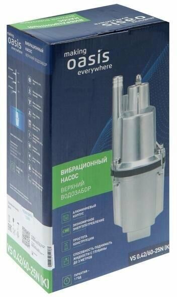 Насос вибрационный, верхний забор воды, мощность 250 Вт, максимальный напор 60 метров, максимальный расход 25 л/мин, длина кабеля 25 метров