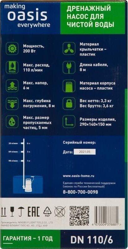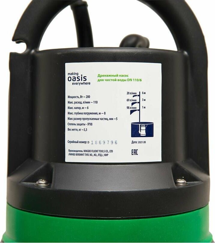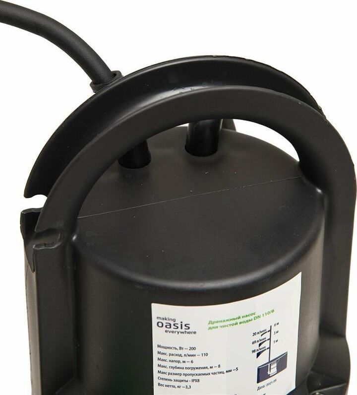 Мощность, Вт - 200. Макс. расход, л/мин - 110. Макс. напор, м - 6. Макс. глубина погружения, м - 8. Макс. размер пропускаемых частиц, мм - 5. Материал корпуса насоса - Пластик. Длина кабеля, м - 10. Материал крыльчатки - Пластик. Габаритные размеры, см - 16,5х15,6х18,2.