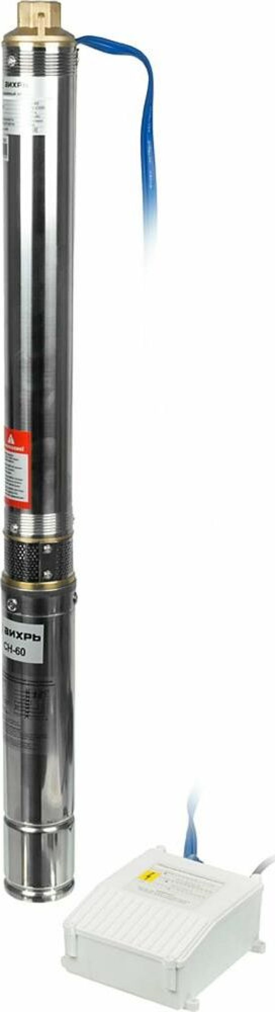 Скважинный насос ВИХРЬ СН-60. Мощность, Вт – 800; Диаметр насоса, мм – 75; Максимальная высота подъема, м - 60; Максимальная подача, л/мин – 50; Выходное отверстие, дюйм – 1;