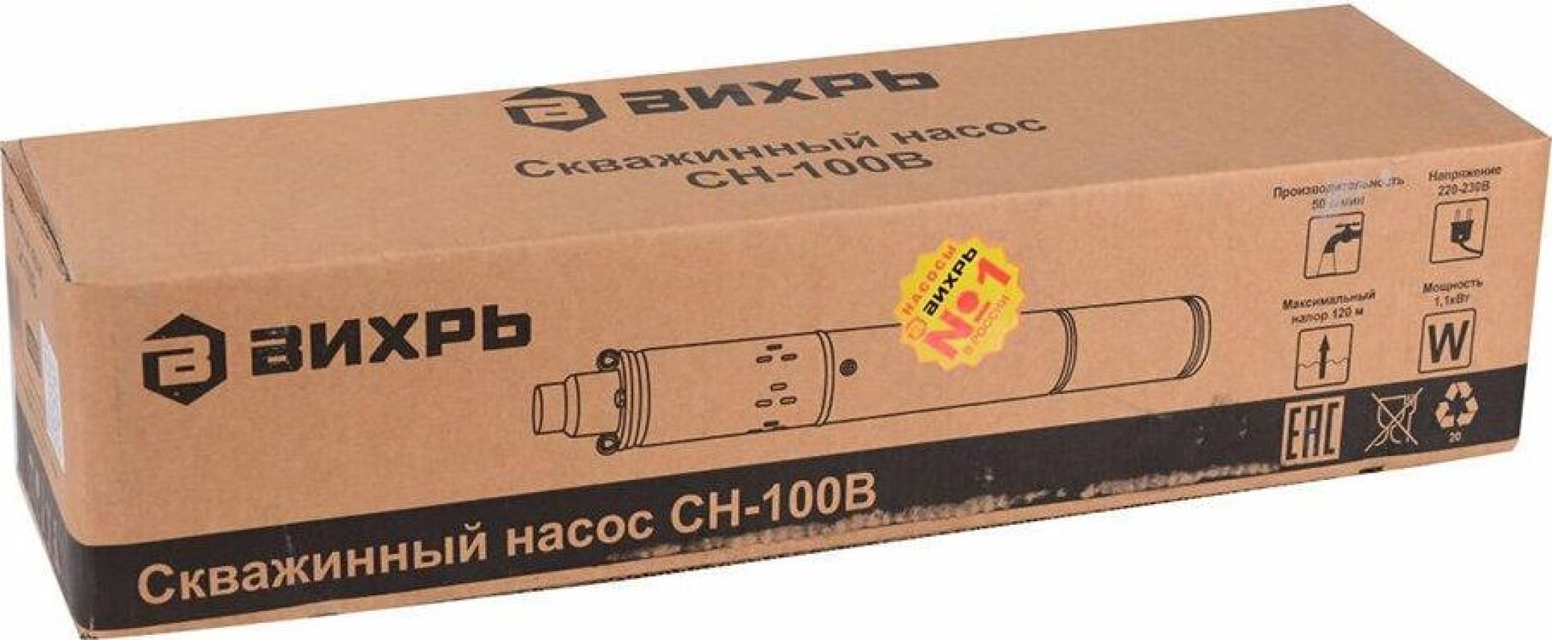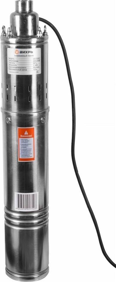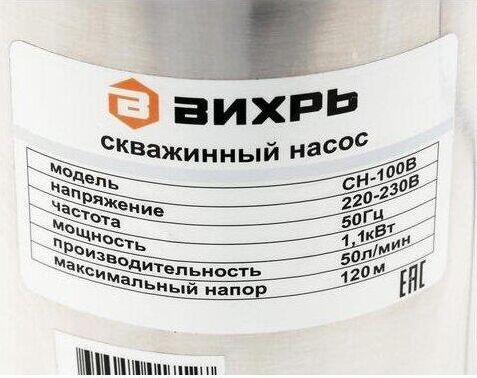 Скважинный насос ВИХРЬ СН-100B. Мощность, Вт – 1100; Диаметр насоса, мм – 102; Максимальная высота подъема, м - 100; Максимальная подача, л/мин – 50; Выходное отверстие, дюйм – 1;