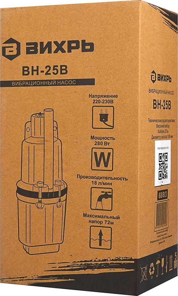 Высота подъема, м 72. Глубина погружения, м 3. Забор воды верхний. Мощность, Вт 280. Производительность, л/мин 18. Трубное соединение, дюйм елочка 3/4. Тип колодезный. Диаметр насоса, мм 100. Длина кабеля, м 25. Вид погружной. Защита от сухого хода нет. Мах температура жидкости, °С 35. Min уровень воды, мм 600. Соединитель в комплекте нет. Допустимая температура жидкости, °С +35°C. Класс защиты IPX8. Напряжение, В 220. Материал корпуса алюминиевый сплав. Серия ВН. Конструкция вибрационный.