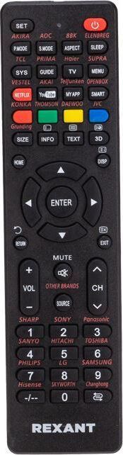 Универсальный пульт для телевизора REXANT отличается простотой в использовании и совместим с большинством марок и моделей современных телевизоров, таких как: VESTEL, GRUNDIG, SHIVAKI, AKIRA, DAEWOO, KONKA, PRIMA, JVC, THOMSON, HISENSE, TCL, SHARP, SONY, PANASONIC, SANYO, HITACHI, TOSHIBA, PHILIPS, LG, SAMSUNG, ERISSON, FUNAI, CHANGHONG, AIWA, SKYWORTH. Пульт поддерживает такие функции, как: меню, настройки, стандартные настройки, субтитры, канал, громкость, язык и т. д., что обеспечивает максимально полное и удобное управление телевизором. Имеет низкое энергопотребление, удобен и прост в настройке. Питание устройства осуществляется от 2 батареек типа ААА (в комплект не входят). Кол-во кнопок: 49 шт.