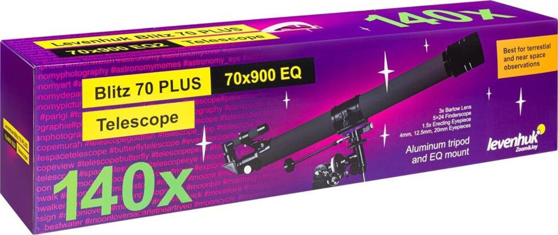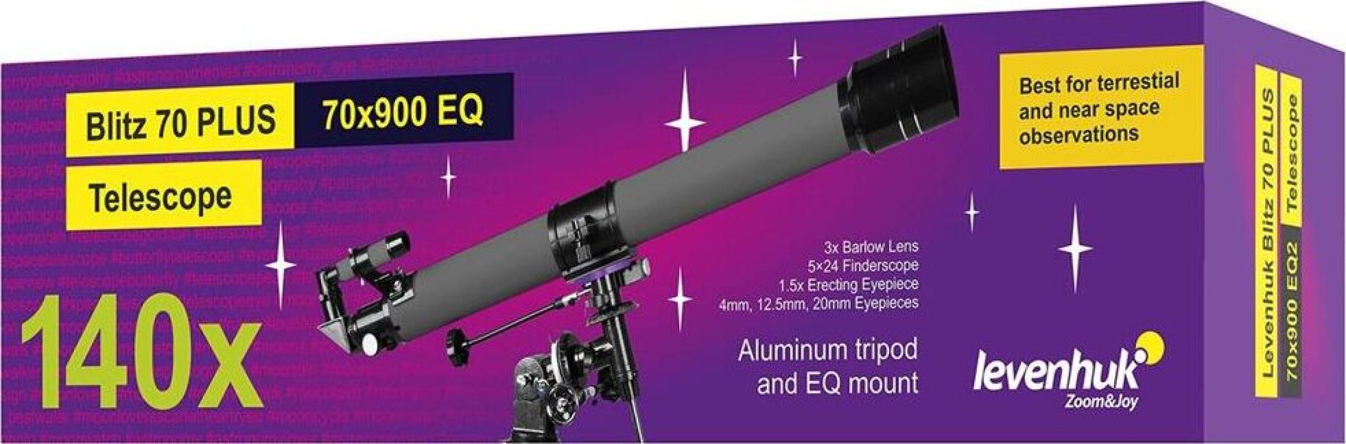 Тип телескопа рефрактор. Оптическая схема ахромат. Материал оптики оптическое стекло. Диаметр объектива (апертура), мм 70. Фокусное расстояние, мм 900. Максимальное полезное увеличение, крат 140. Светосила (относительное отверстие) f/12,8. Разрешающая способность, угл. секунд 12,8". Проницающая способность (звездная величина, приблизительно) 11,33. Окуляры в комплекте SR4 мм (225х), H12,5 мм (72х), H20 мм (45х), оборачивающий окуляр 1,5х. Посадочный диаметр окуляров, дюймов 1,25. Линза Барлоу в комплекте 3x. Искатель 5x24, оптический. Фокусер реечный. Тренога алюминиевая. Высота треноги, мм 670–1230. Лоток для аксессуаров есть. Тип управления телескопом ручной. Тип монтировки экваториальная EQ2. Способ крепления трубы кольцо. Материал трубы металл. Уровень пользователя для начинающих. Уровень сложности сборки и настройки просто. Предмет наблюдения планеты Солнечной системы, наземные объекты.