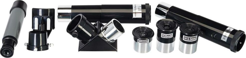 Комплектация: оптическая труба телескопа; окуляр SR4 мм; окуляр H12,5 мм; окуляр H20 мм; оборачивающий окуляр 1,5х; линза Барлоу 3х; диагональное зеркало 90°; оптический искатель 5х24; экваториальная монтировка EQ2; ручки тонких движений; штанга противовеса; противовес