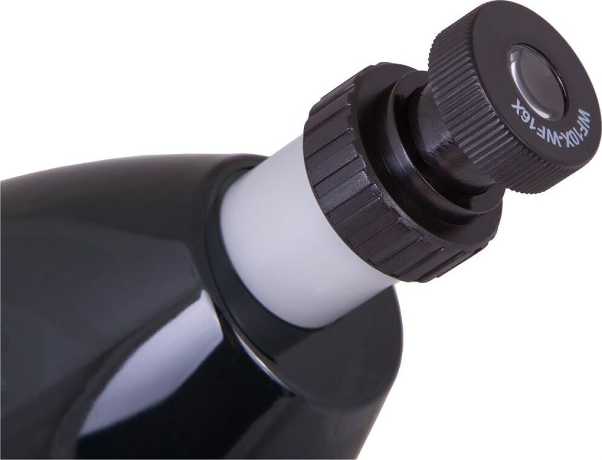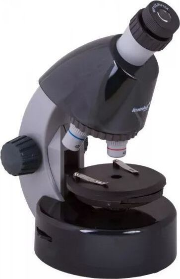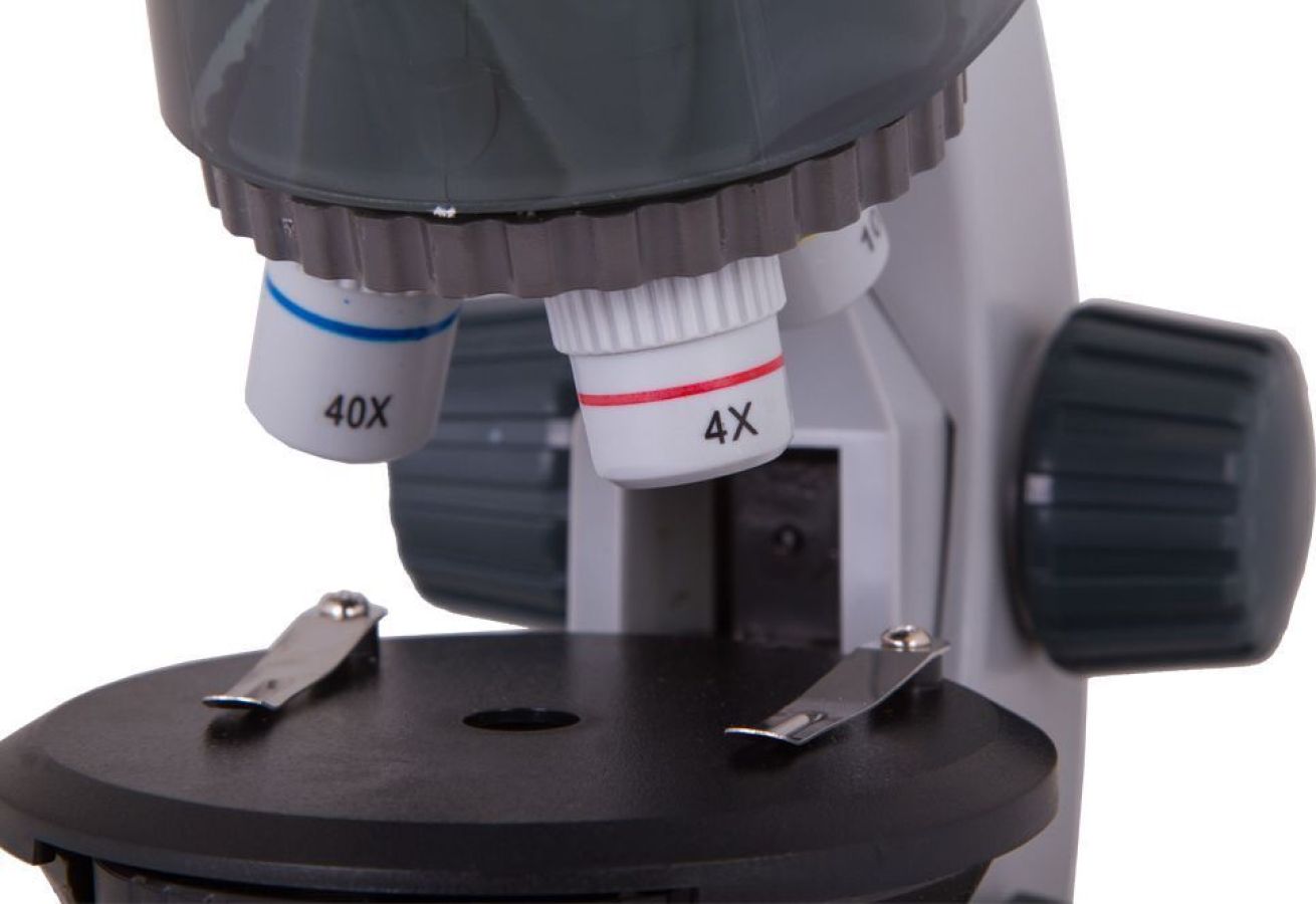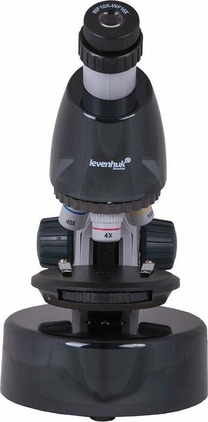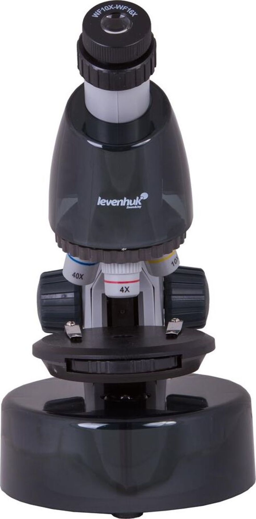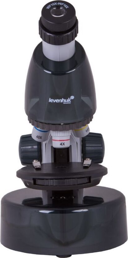 круглый предметный столик с зажимами, объективы: 4х, инструкция по эксплуатации и гарантийный талон, 10х и 40х, микроскоп, диск с диафрагмами, окуляр WF10x–16x, набор для опытов Levenhuk K50 (в наборе: руководство «Интересный микроскоп. Изучаем микромир»,