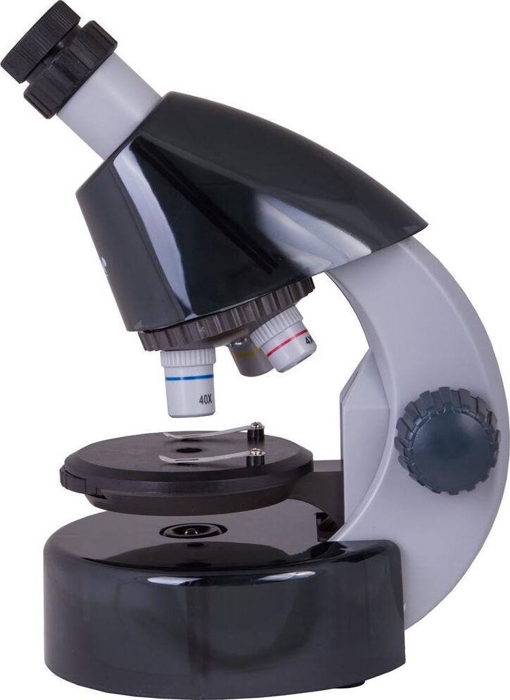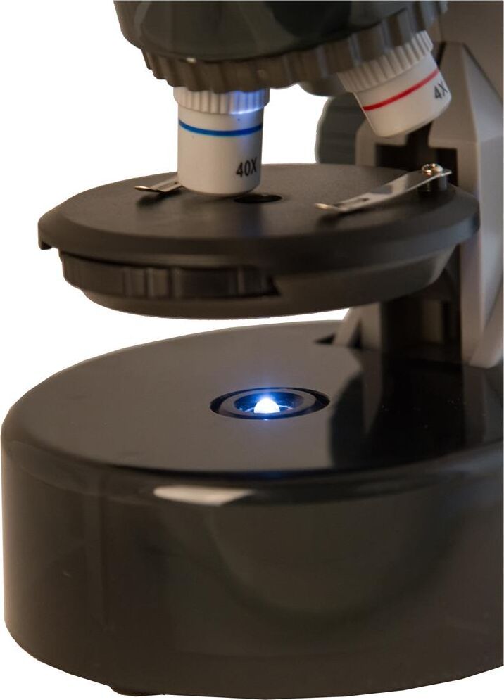 Тип микроскопа биологические. Тип насадки монокулярные. Материал оптики полимерное оптическое стекло. Угол наклона окулярной насадки 45°. Увеличение, крат 40–640. Диаметр окулярной трубки, мм 30. Окуляры WF10x–16x (двухпозиционный). Объективы 4x, 10x, 40x. Револьверное устройство на 3 объектива. Предметный столик, мм o82, с зажимами. Диапазон перемещения предметного столика, мм 0–15 по вертикали. Диафрагма диск с диафрагмами (6 отверстий). Фокусировка грубая. Корпус пластик. Подсветка светодиодная. Регулировка яркости есть. Питание от батареек 2 батарейки типа АА (нет в комплекте). Расположение подсветки нижняя. Метод исследования светлое поле. Набор для опытов в комплекте есть.