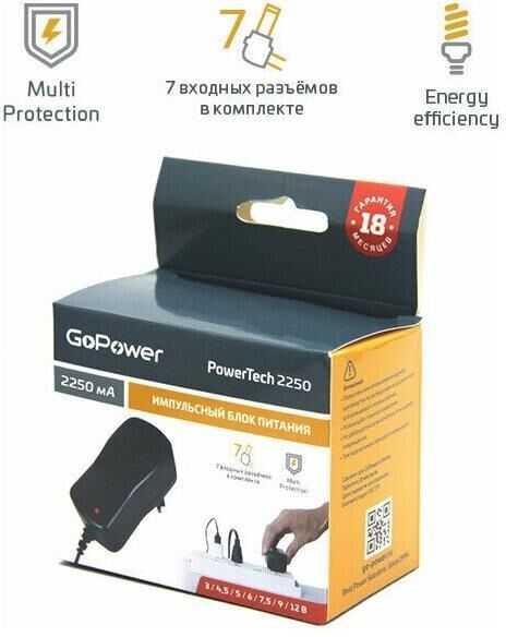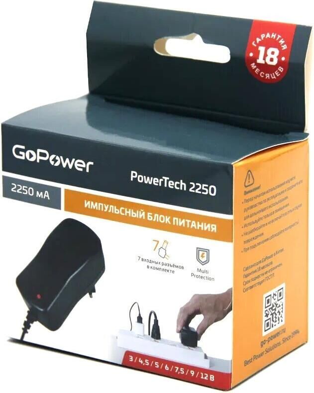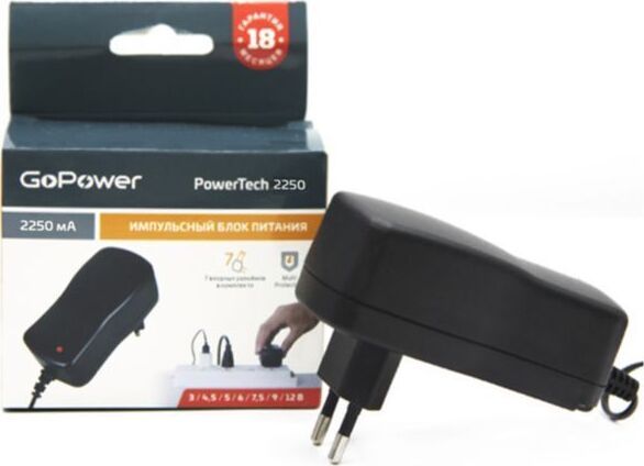 Универсальный импульсный блок питания 2250мА. Выходное напряжение устанавливается переключателем: 3,0 / 4,5/ 5,0/ 6,0 / 7,5 / 9,0 / 12,0 В DC. Максимальный ток 2250 мА. Штекеры: 7 штук - 5,0 х 2,1мм, 5,5 х 2,5 мм, 4,0 х 1,7 мм, 2,35 х 0,75 мм, 3,5 х1,35 мм, 2,5/12мм, 3,5/15мм. Технология «Multi Protection»: защита от короткого замыкания и перегрузок. Светодиодная индикация.