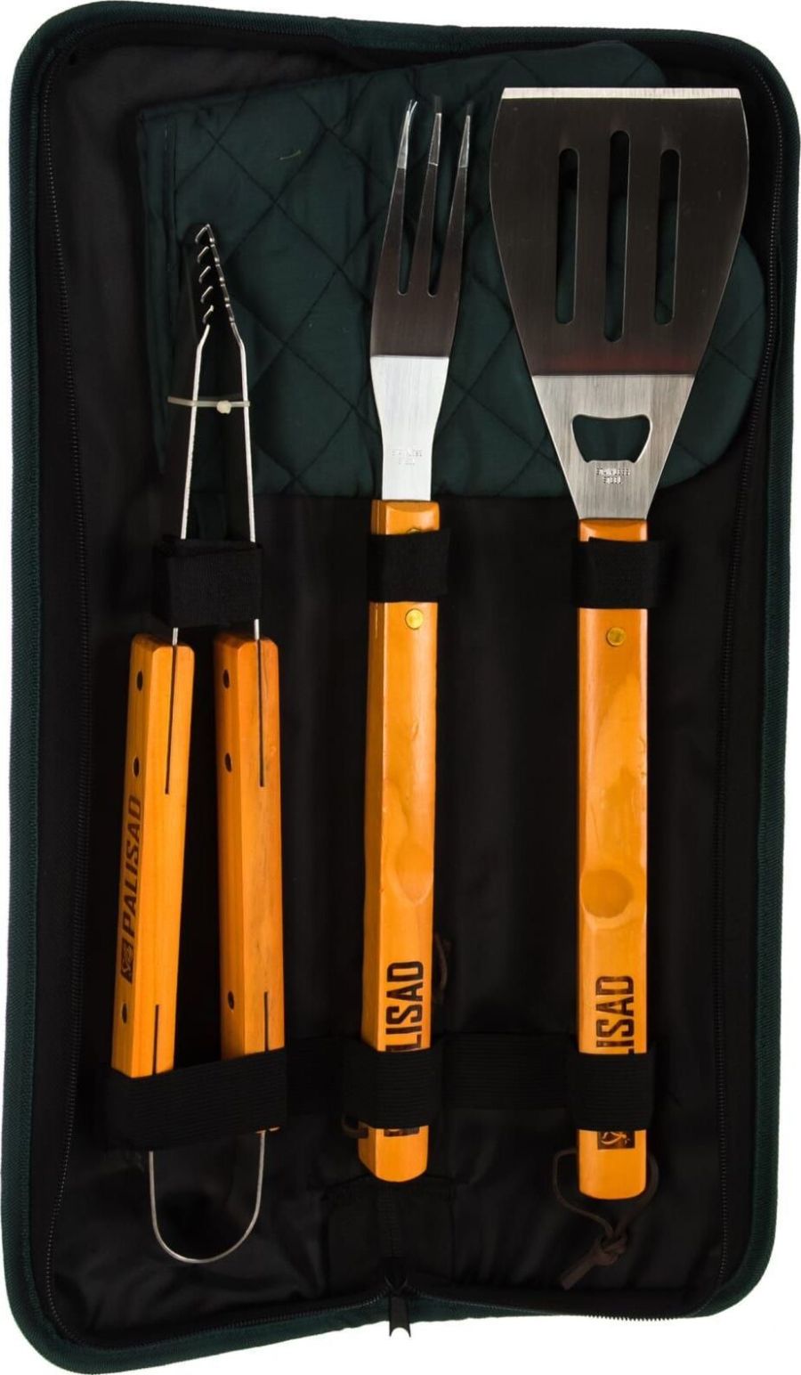 Набор приборов для барбекю предназначен для безопасного приготовления продуктов на открытом воздухе. Особенности: Рабочая часть приборов изготовлена из пищевой нержавеющей стали. Эргономичная деревянная рукоятка. Компактная сумка; Комплектация: Сумка, нож, вилка, щипцы, рукавица. Материал рукавицы полиэстер. Материал сумки полиэстер. Преимущества; Приборы удобны и безопасны в процессе эксплуатации (рукоятка не нагревается). Удобен при транспортировке и хранении.