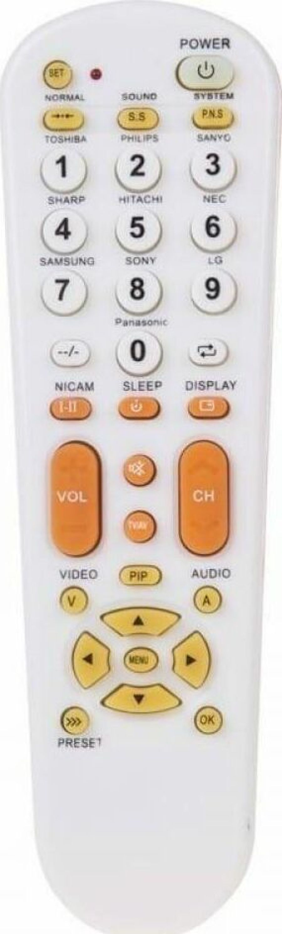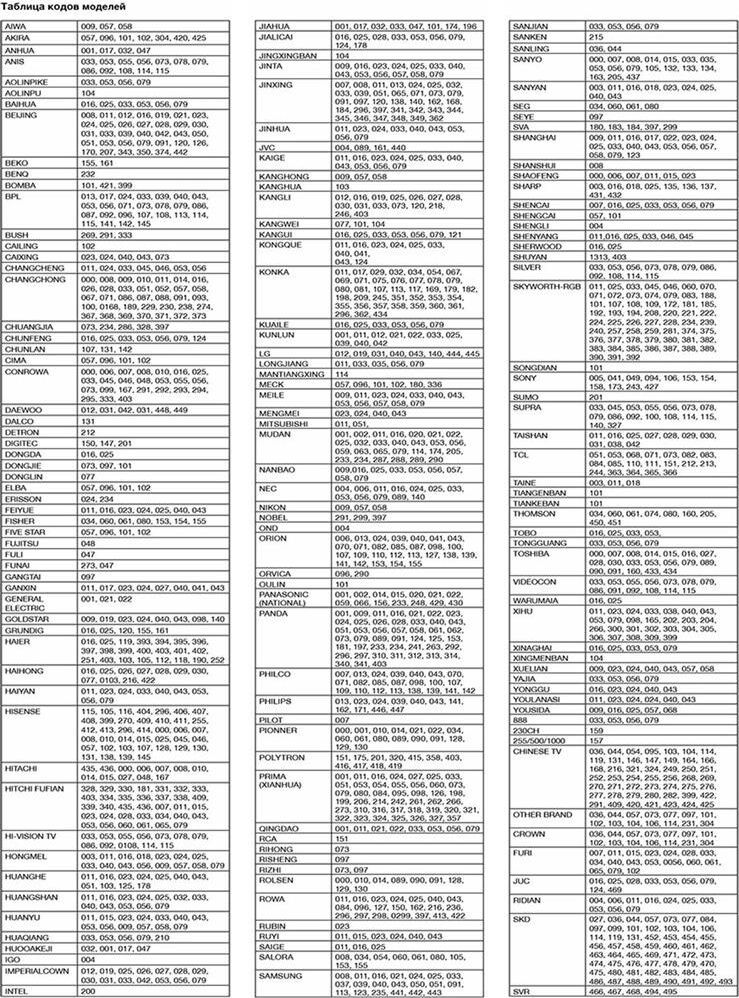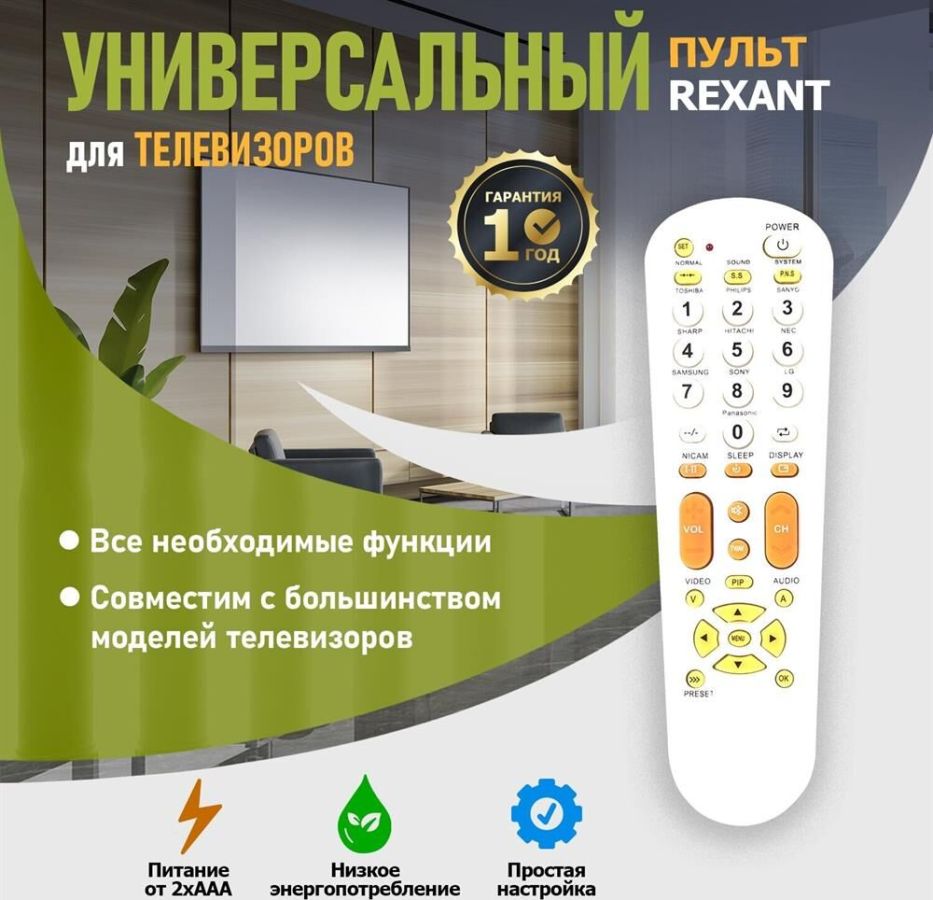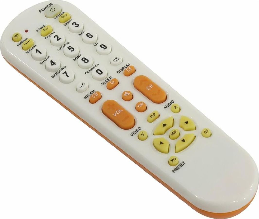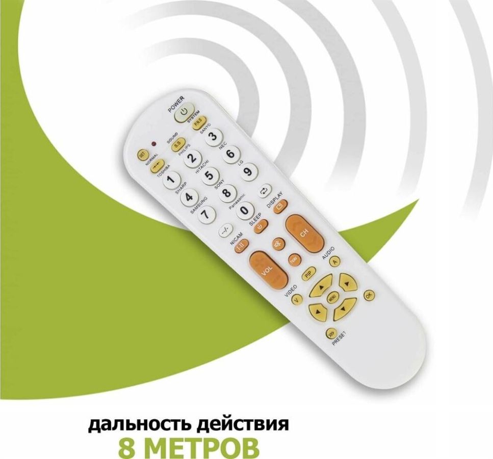 Универсальный пульт для телевизора, отличается простотой в использовании и совместим с большинством марок и моделей современных телевизоров, таких как: TOSHIBA, PHILIPS, SANYO, SHARP, HITACHI, NEC, SAMSUNG, SONY, LG, PANASONIC. Универсальный пульт поддерживает такие функции, как: меню, настройки, стандартные настройки, субтитры, канал, громкость, язык и т. д., что обеспечивает максимально полное и удобное управление телевизором. Имеет низкое энергопотребление, удобен и прост в настройке. Размер пульта: 16.5х4.5х3.5 см