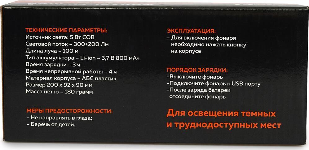 Комплектация: Фонарь; кабель USB; упаковка. , Мощность, Вт: 5 , Кол-во режимов: 4 , Модель светодиода: СОВ , Размер (ДхШхВ), см: 20*9.2*9 , Кол-во светодиодов: 1