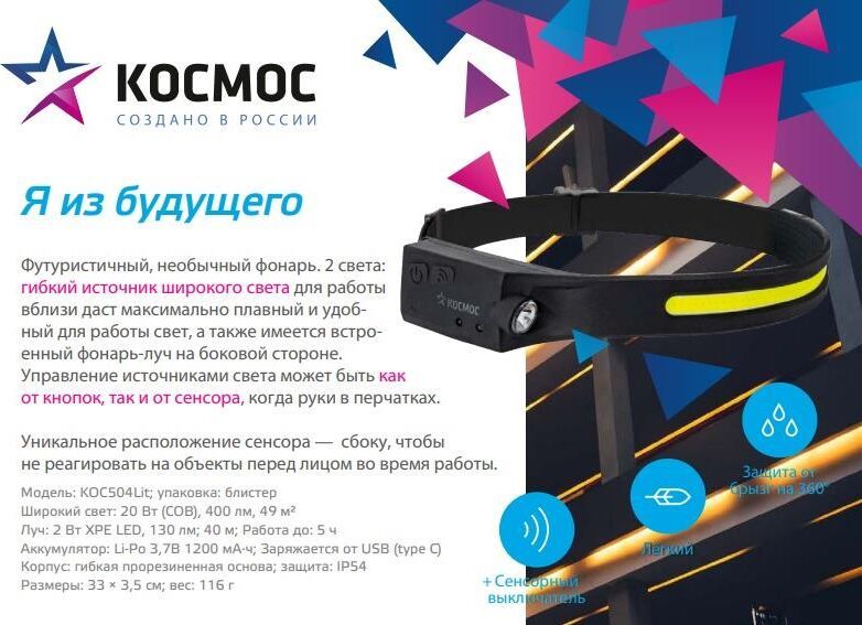 Фонарь налобный КОСМОС (KOC504Lit) - футуристичный, необычный фонарь. 2 света: гибкий источник широкого света для работы вблизи даст максимально плавный и удобный для работы свет, а также имеется встроенный фонарь-луч на боковой стороне. Управление источниками света может быть как от кнопок, так и от сенсора, когда руки в перчатках. Уникальное расположение сенсора - сбоку, чтобы не реагировать на объекты перед лицом во время работы. Источник света: широкий свет 20Вт COB LED; луч 2Вт XPE LED; Источник питания: Li-po аккумулятор 102540 3,7В 1200 мА/ч (встроенный), зарядный USB-шнур type C в комплекте; Количество режимов: 4 (отдельная кнопка: широкий свет яркий, экономичный/луч яркий, экономичный; отдельная кнопка - сенсорный режим); Световой поток: 400 лм. (широкий свет)/130 лм. (луч); Дистанция освещения: 49м2 (широкий свет)/40 м. (луч); Корпус: гибкая прорезиненная основа; IP54; Размер: 28x3x1.8 см.; встроенный налобный регулируемый эластичный ремешок