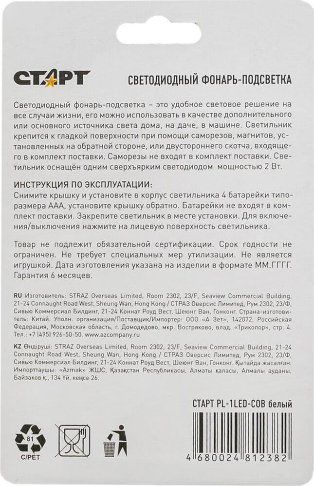 Гарантийный срок: 6 мес. , Комплектация: Фонарь-подсветка Старт PL-1LED-COB