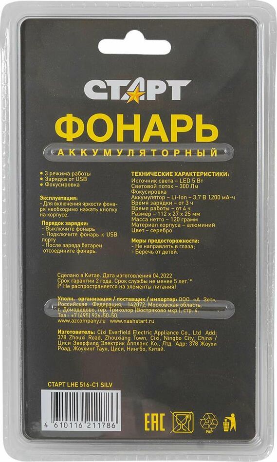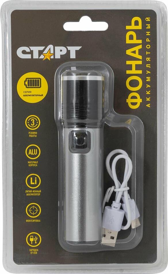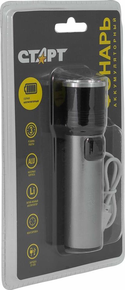 Фонарь. Источник света: LED, 5 Вт Тип аккумулятора: Li-Ion, 3,7 В, 1200 мАч Световой поток, Лм: 300 Время зарядки: от 3 ч Время работы: от 4 ч Материал корпуса: алюминий Габариты, мм: 112 х 27 х 25 Масса нетто, г: 120 Цвет корпуса: серебряный 3 режима работы Зарядка от USB Фокусировка