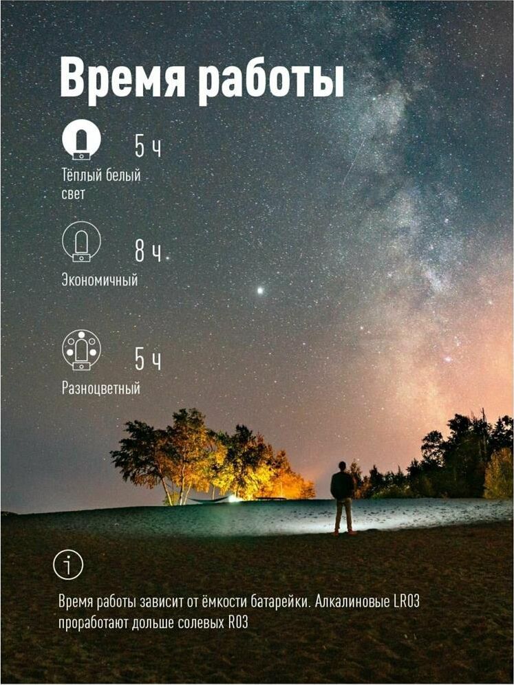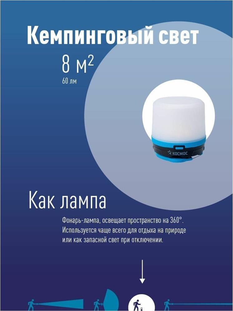 Фонарь КОСМОС (KOC602B) — компактная кемпинговая лампа с мягким, теплым светом и режимом мультиколор. Можно как поставить на стол, так и подвесить за встроенный карабин. Отдельный режим мультисвета – для отдыха и праздника. Освещает пространство вокруг себя на 360 градусов. 3 режима работы: яркий теплый свет, средний теплый свет и мультисвет. Благодаря матовому рассеивателю, можно использовать как мини-ночник на неярком режиме. Источник света: 2 Вт LED (теплый свет) + RGB LED (мультиколор); Источник питания: 3xAAA (в комплект не входят); Количество режимов: 3 (яркий теплый свет-экономичный теплый свет — мультиколор); Световой поток: 60 лм.; Дистанция освещения: 8 м2; Корпус: ABS-пластик, IP54; Компактный размер: 7.2x7.2x7.0 см.; Матовый рассеиватель; Складная ручка-крепление для подвешивания.