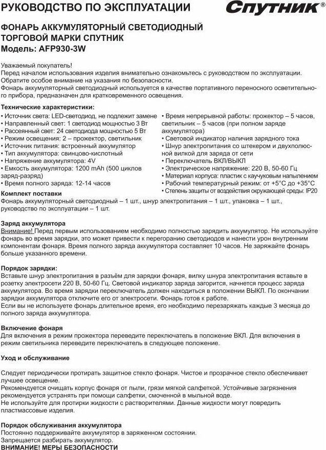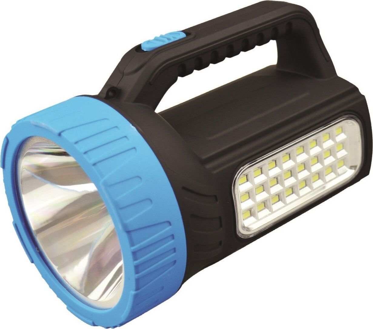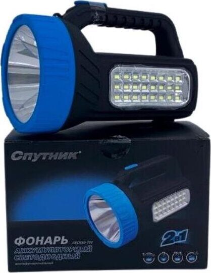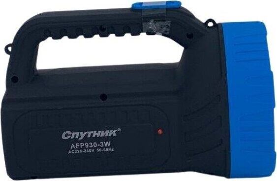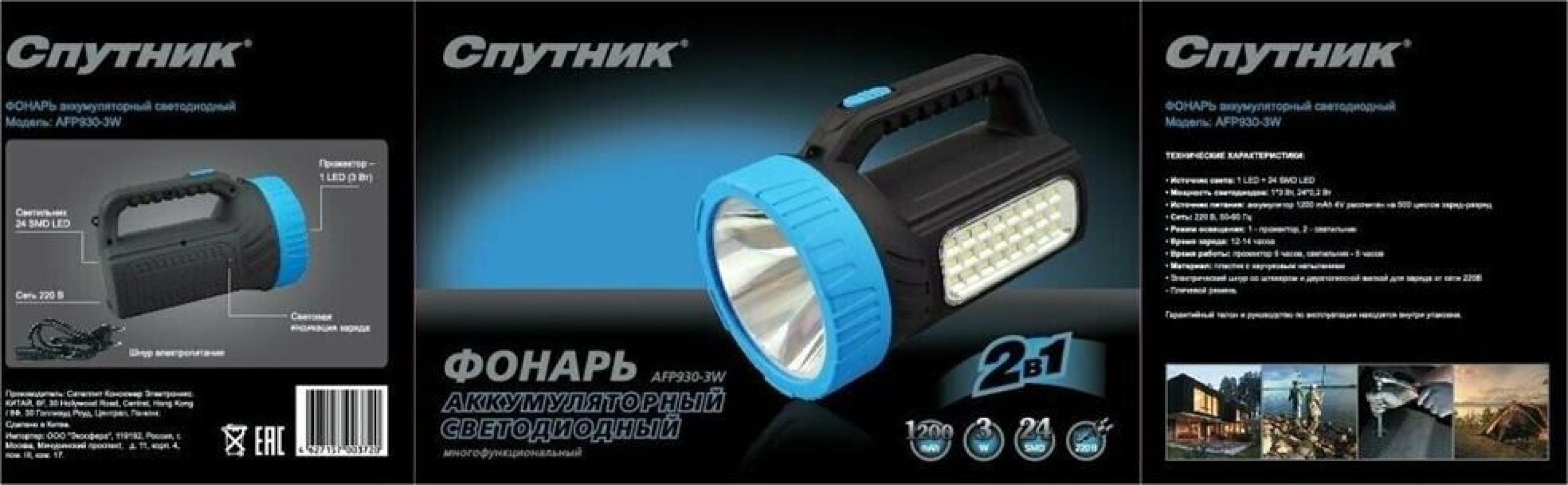 AFP930-3W прожектор+светильник / 1 LED мощностью 3 Вт + 24 SMD LED мощностью 4,8 Вт / аккумулятор 1200 mAh 4V / время заряда: 12-14 ч / время непрерывной работы: до 5 ч / материал корпуса: пластик с каучуковым напылением / цвет корпуса: чёрный/голубой / индивидуальная цветная коробка