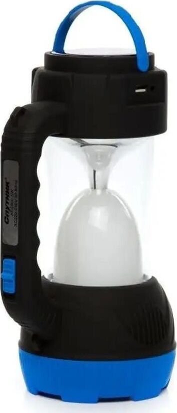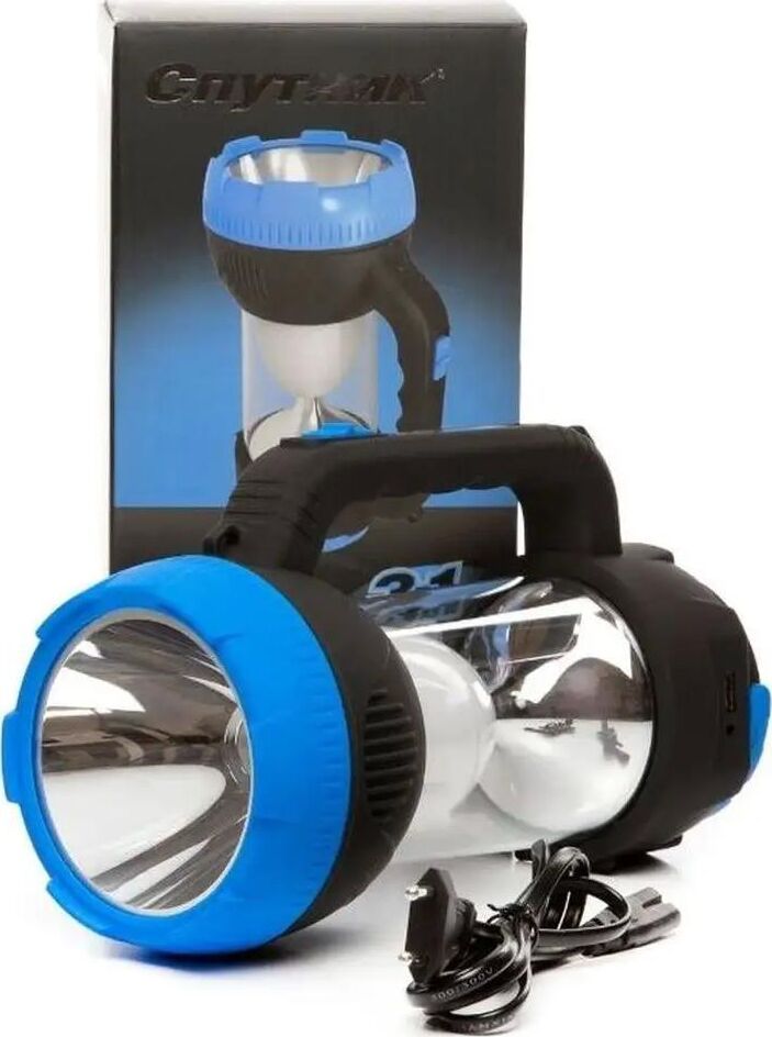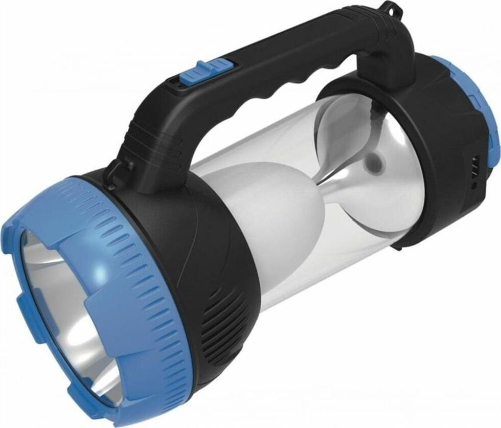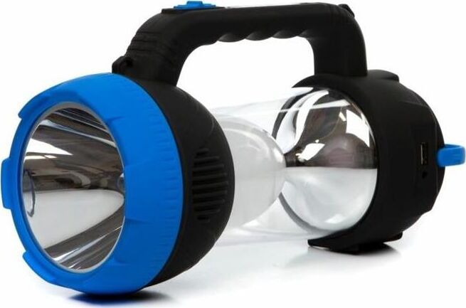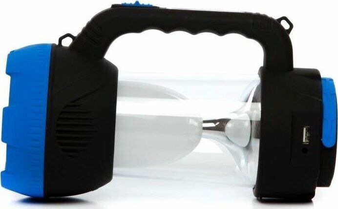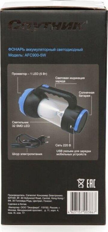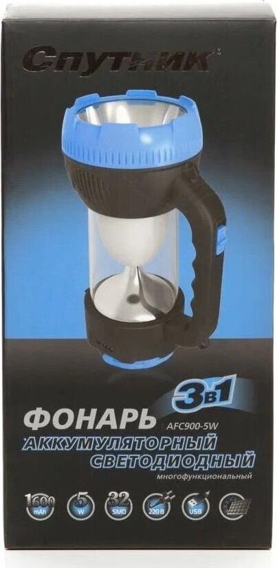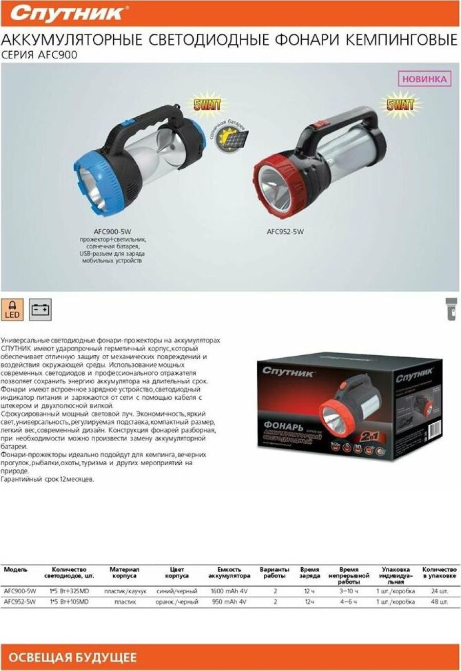 AFС900-5W прожектор+светильник / 1 LED мощностью 5 Вт + 32 SMD LED мощностью 6,4 Вт / литиевый аккумулятор 1600 mAh 4V / время заряда: 12 ч / время непрерывной работы: 3-10 ч / возможность заряда аккумулятора через солнечную батарею / материал корпуса: пластик с каучуковым напылением / цвет корпуса: чёрный/синий / индивидуальная цветная коробка