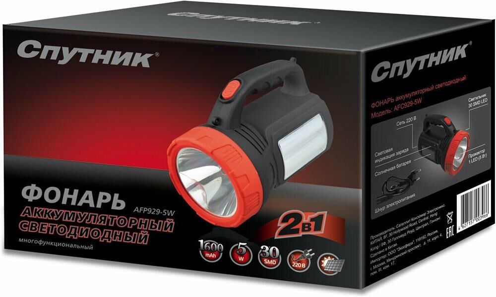 AFP929-5W прожектор+светильник / 1 LED мощностью 5 Вт + 30 SMD LED мощностью 6 Вт / аккумулятор 1600 mAh 4V / время заряда: 12 ч / время непрерывной работы: до 4 ч / материал корпуса: пластик с каучуковым напылением / цвет корпуса: чёрный/красный / индивидуальная цветная коробка
