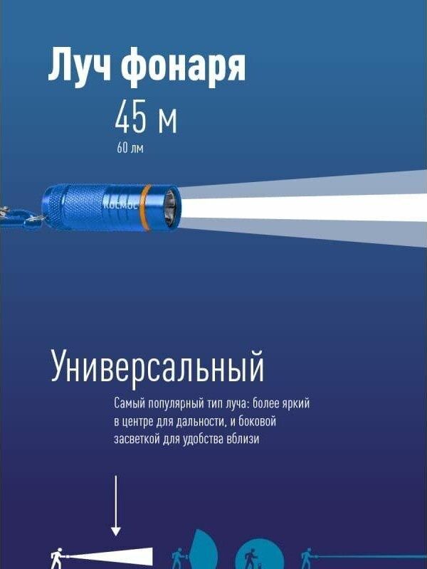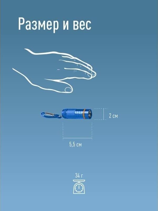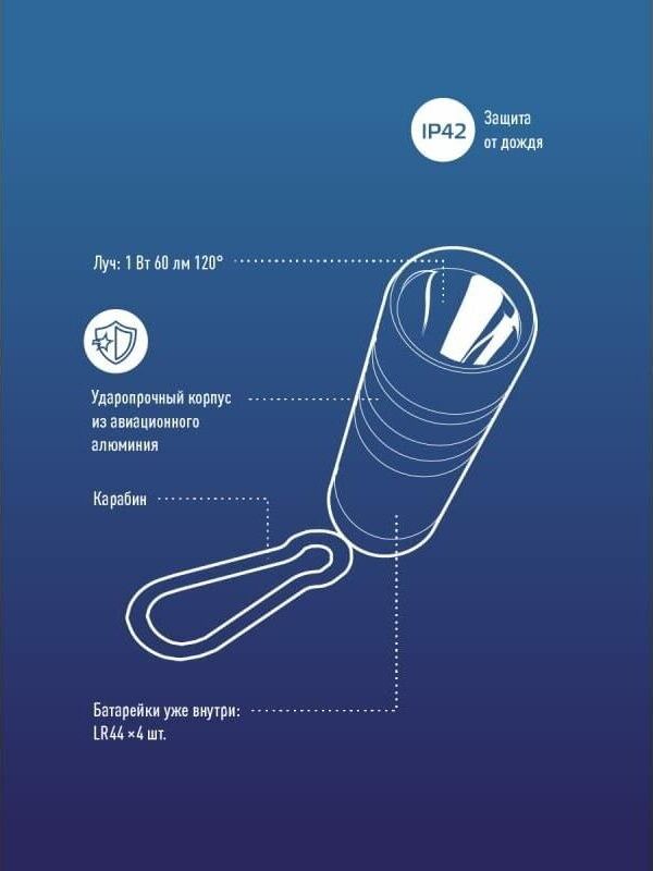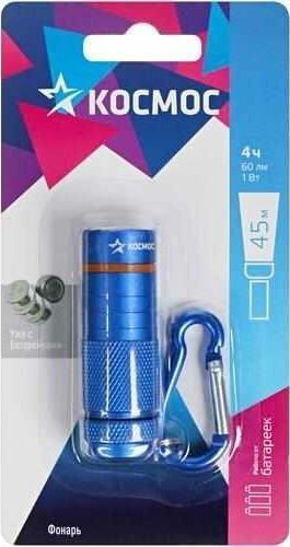 Карманный фонарь-брелок КОСМОС (KOC205B) с карабином в прочном корпусе из анодированного алюминия. Легкий и маленький корпус – легко носить вместе с ключами и документами. Батарейки уже внутри. Луч фонаря – светит вперед, направленный свет. Источник света: 1 Вт SMD LED; Источник питания: 4xLR44 (входят в комплект); Количество режимов: 1 (луч); Световой поток: 60 лм.; Дистанция освещения: 45 м.; Корпус: анодированный алюминий, IP42; Компактный карманный размер: 5.5x2.0x2.0 см.; Карабин.