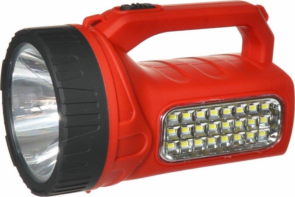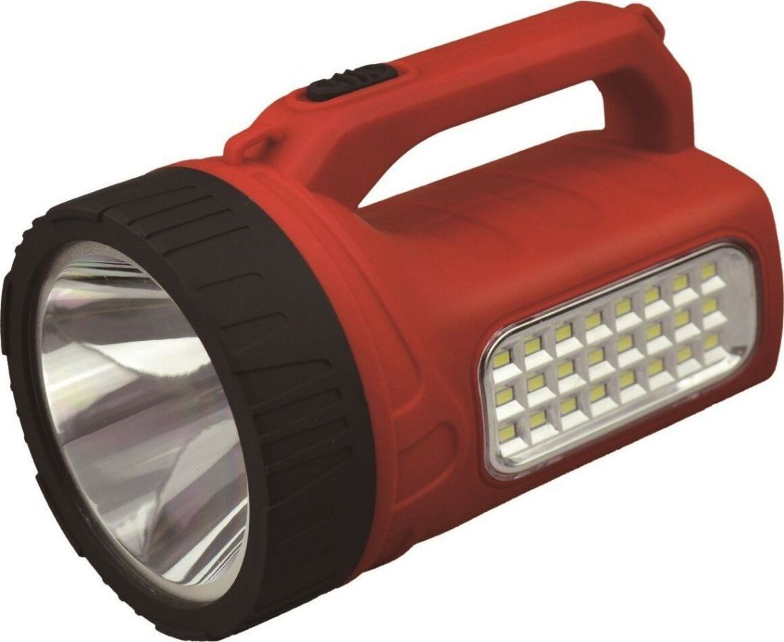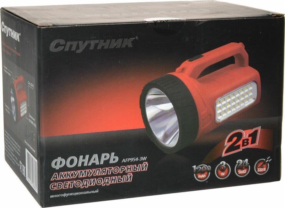 AFP954-3W прожектор+светильник / 1 LED мощностью 3 Вт + 24 SMD LED мощностью 4,8 Вт / аккумулятор 1200 mAh 4V / время заряда: 15 ч / время непрерывной работы: 4-5 ч / материал корпуса: пластик с каучуковым напылением / цвет корпуса: красный/чёрный / индивидуальная цветная коробка