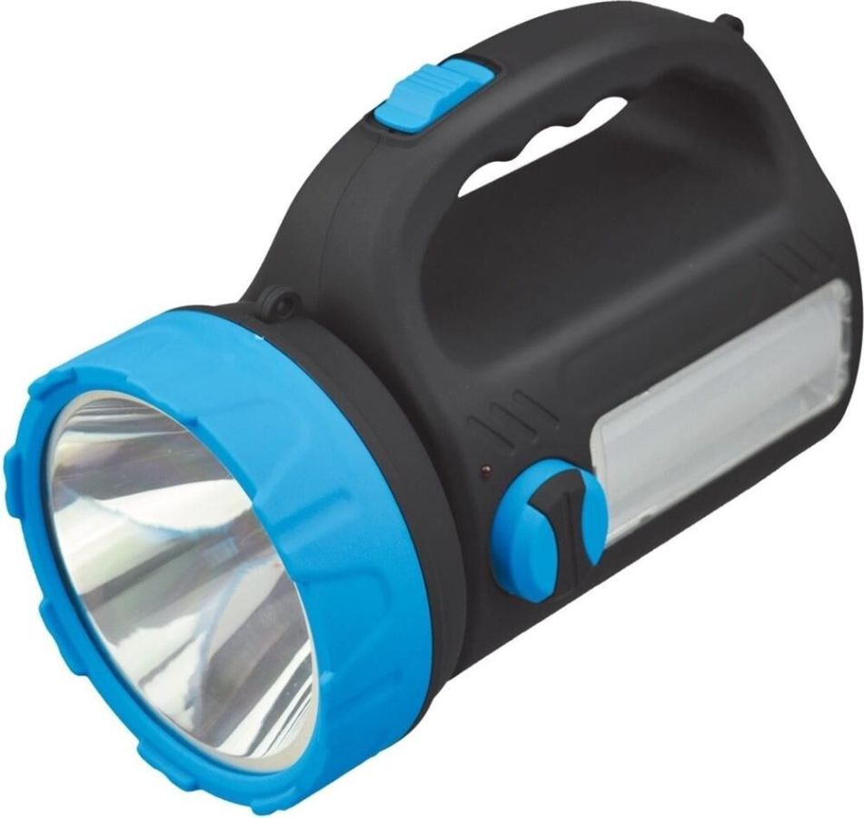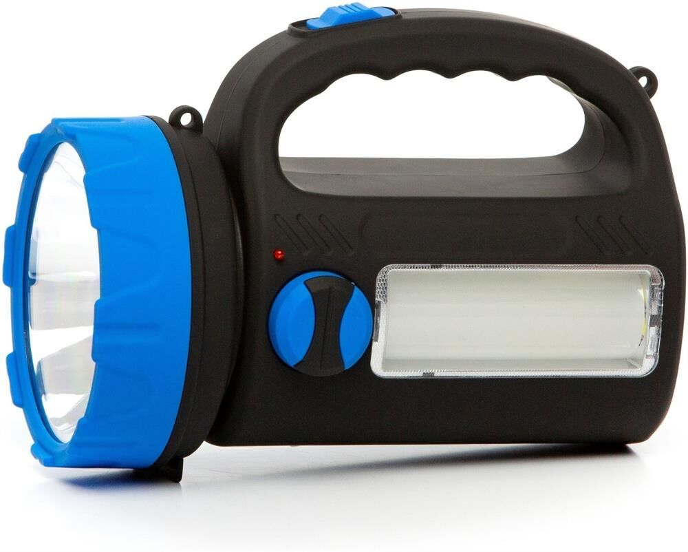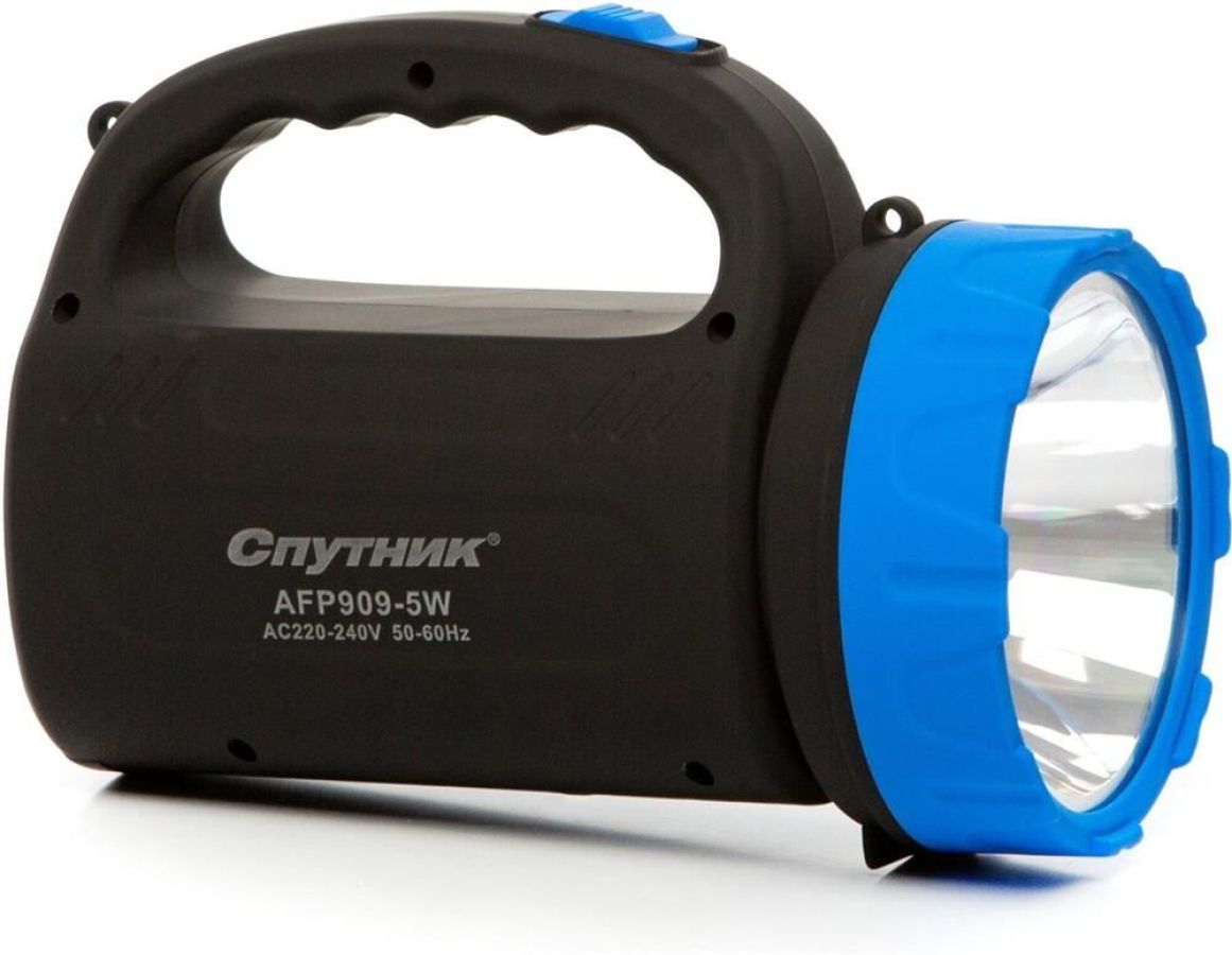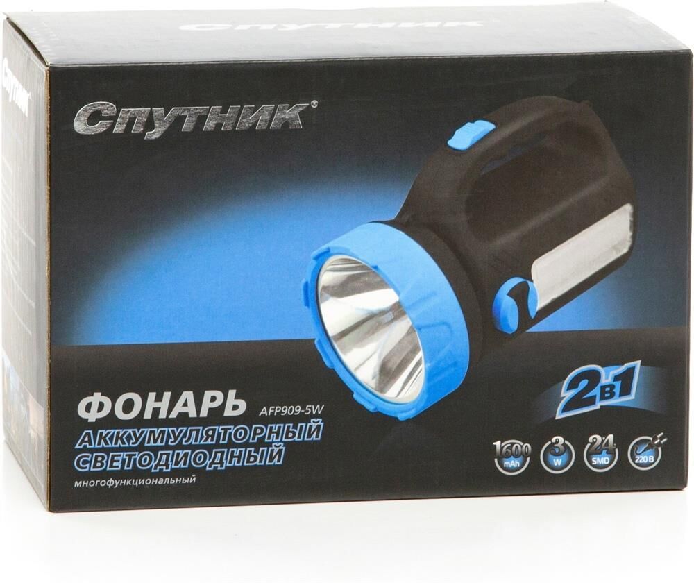 AFP909-5W прожектор+светильник / 1 LED мощностью 5 Вт + 24 SMD LED мощностью 4,8 Вт / регулировка яркости светильника / аккумулятор 1600 mAh 4V / время заряда: 13-15 ч / время непрерывной работы: 4-5 ч / материал корпуса: пластик с каучуковым напылением / цвет корпуса: чёрный/голубой / индивидуальная цветная коробка