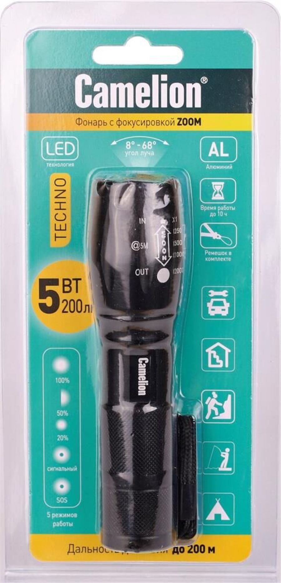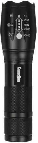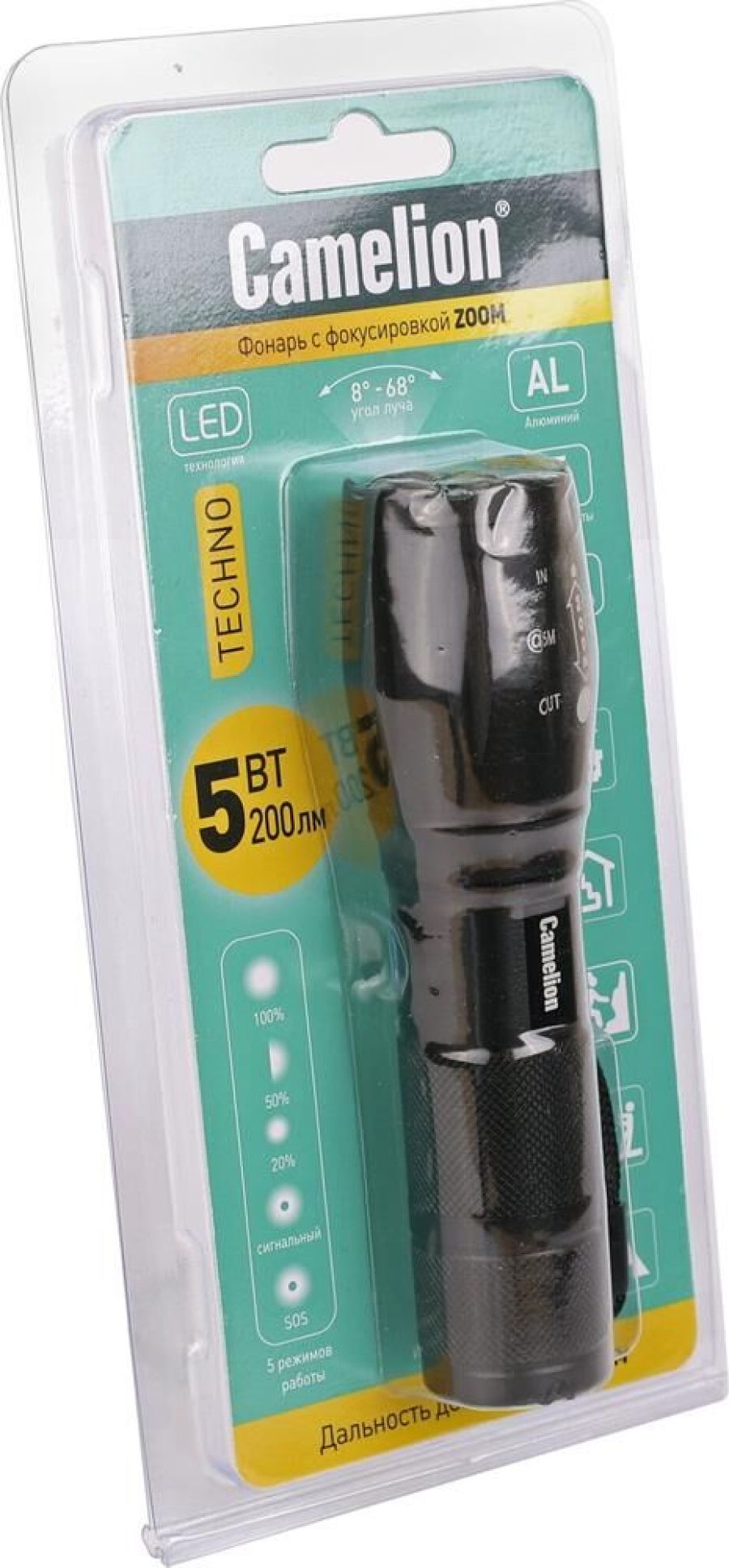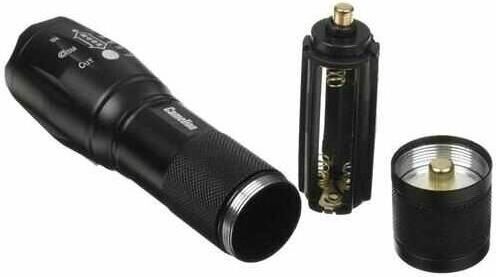 Фонарь электрический светодиодный. Цвет корпуса - черный. Работает от батареек 3xLR03 (не входят в комплект). Материал корпуса - алюминиевый сплав 6061 / Т6 с анодированным защитным покрытием. Источник света: светодиод T6 с потребляемой мощностью 3 Вт с цветовой температурой 6500К, максимальный световой поток 200 люмен. Дистанция освещения- до 200 метров. Пять режимов работы - 100% / 50% / 30% / мигающий / SOS. Универсальность использования - дальний + ближний свет, переменный фокус, регулируемый сдвигом передней части фонаря. Выключатель - пятипозиционный кнопочного типа (с защитной резиновой накладкой) в задней части фонаря. Время работы при использовании алкалиновых батареек: 100% яркости - до 1,5 ч, 50% - до 9 ч, 20% - до 13 ч, мигающий режим и SOS- более 10 ч. Комплектация: фонарь, ремешок, инструкция (внутри корпуса фонаря), упаковка. Степень пыле-влаго-защиты IP45. Максимальный линейный размер фонаря 12,6 см. Вес 0,100 кг.