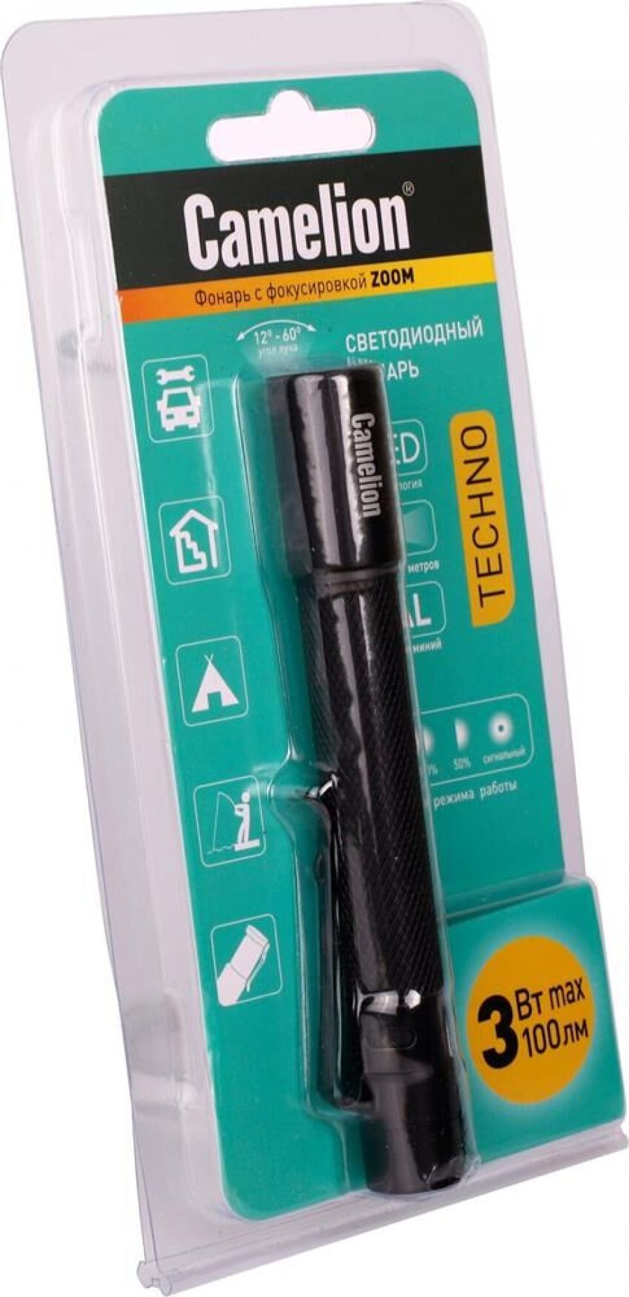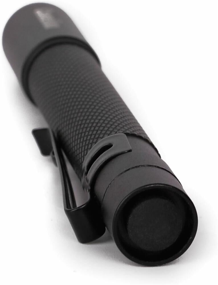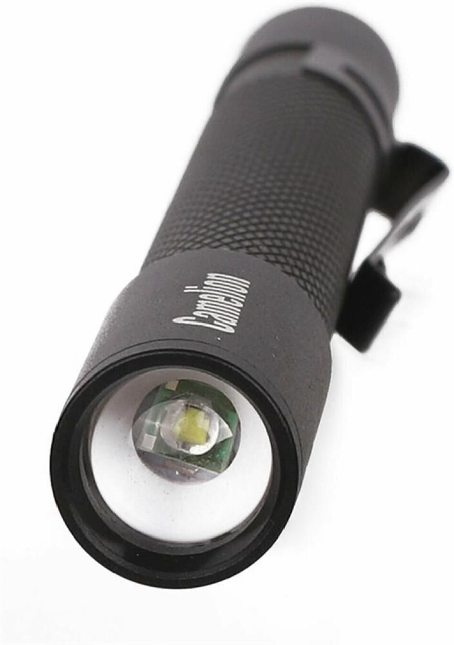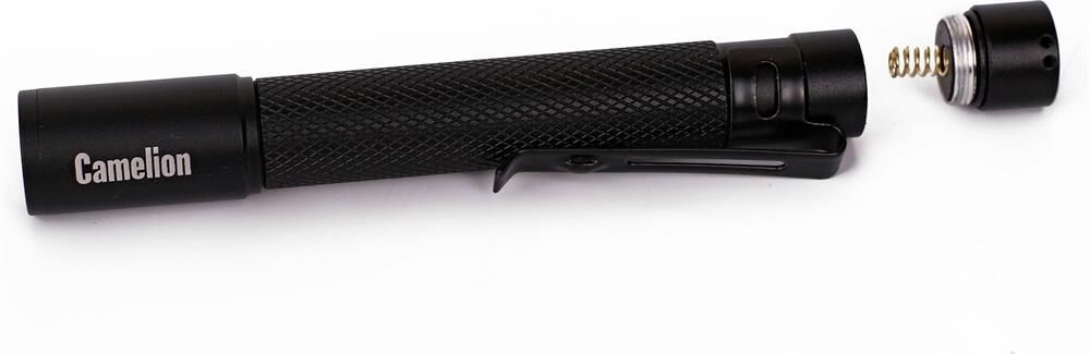светодиодный. Цвет корпуса - черный. Питание от 2xLR03 (не входят в комплект). Материал корпуса - алюминиевый сплав 6061 / Т6 с анодированным защитным покрытием. Источник света: 1 светодиод XP-E 3 Вт, 6500К, 100 люмен. Дистанция освещения- до 200 метров. Три режима работы - 100% / 50% / мигающий режим. Свет: дальний + ближний, переменный фокус, регулируемый сдвигом передней части фонаря. Выключатель - трёхпозиционный кнопочного типа (с защитной резиновой накладкой) в задней части фонаря. Время работы при использовании алкалиновых батареек: 100% мощности - до 0,8 часов, 50% мощности - до 2 часов, мигающий режим - более 1,5 часов. Степень пыле-влаго-защиты IP45. Максимальный линейный размер фонаря 12,2 см. Вес 0,056 кг.