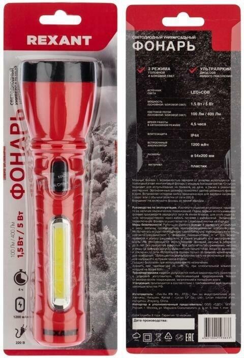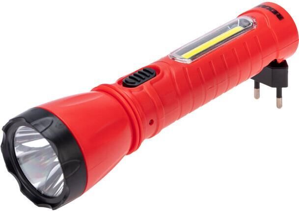 Мощный фонарь REXANT с возможностью зарядки от розетки используется как поисковый и как кемпинговый фонарь с мощным боковым светом. Отлично подходит для использования на привале, на даче, а также в ремонтных мастерских. Эргономичные размеры позволяют удобно размещать фонарь в руке. Встроенная складная вилка предназначена для зарядки напрямую с евро или с обычной розетки от сети 220 В. Внимание! Не включайте фонарь во время зарядки.