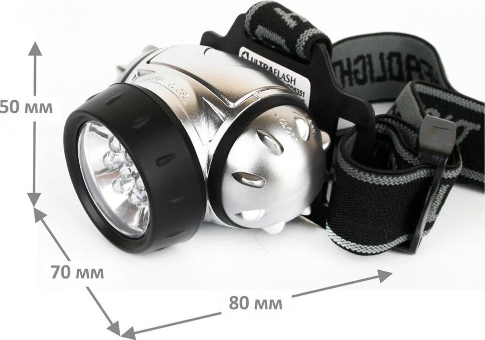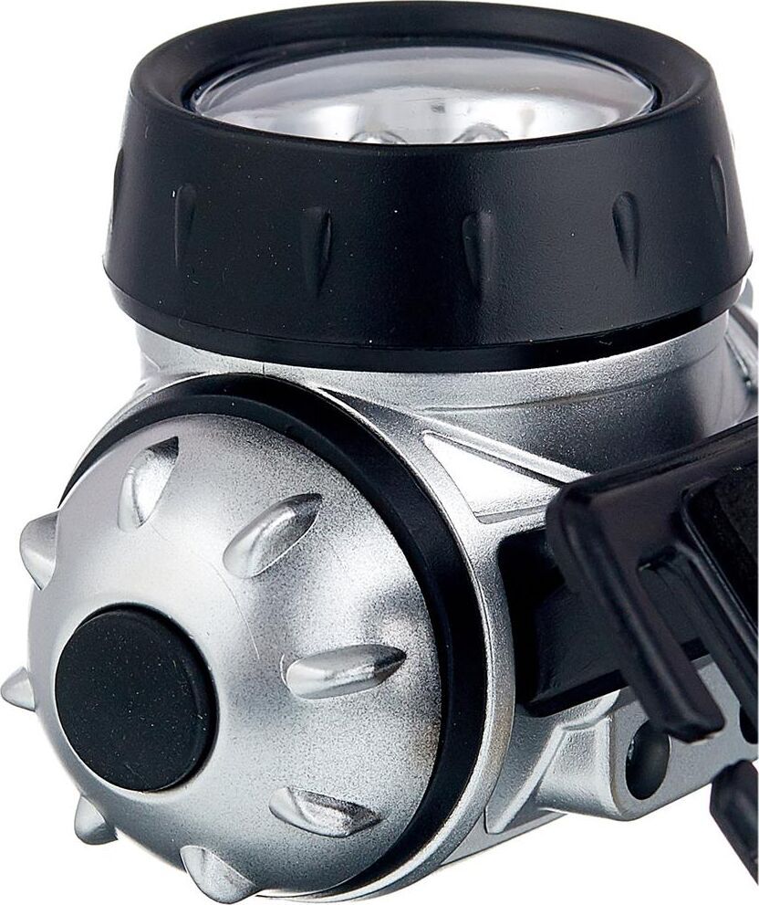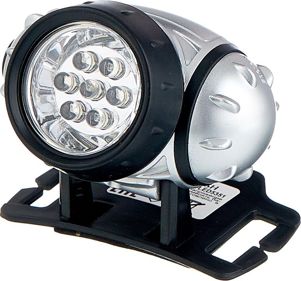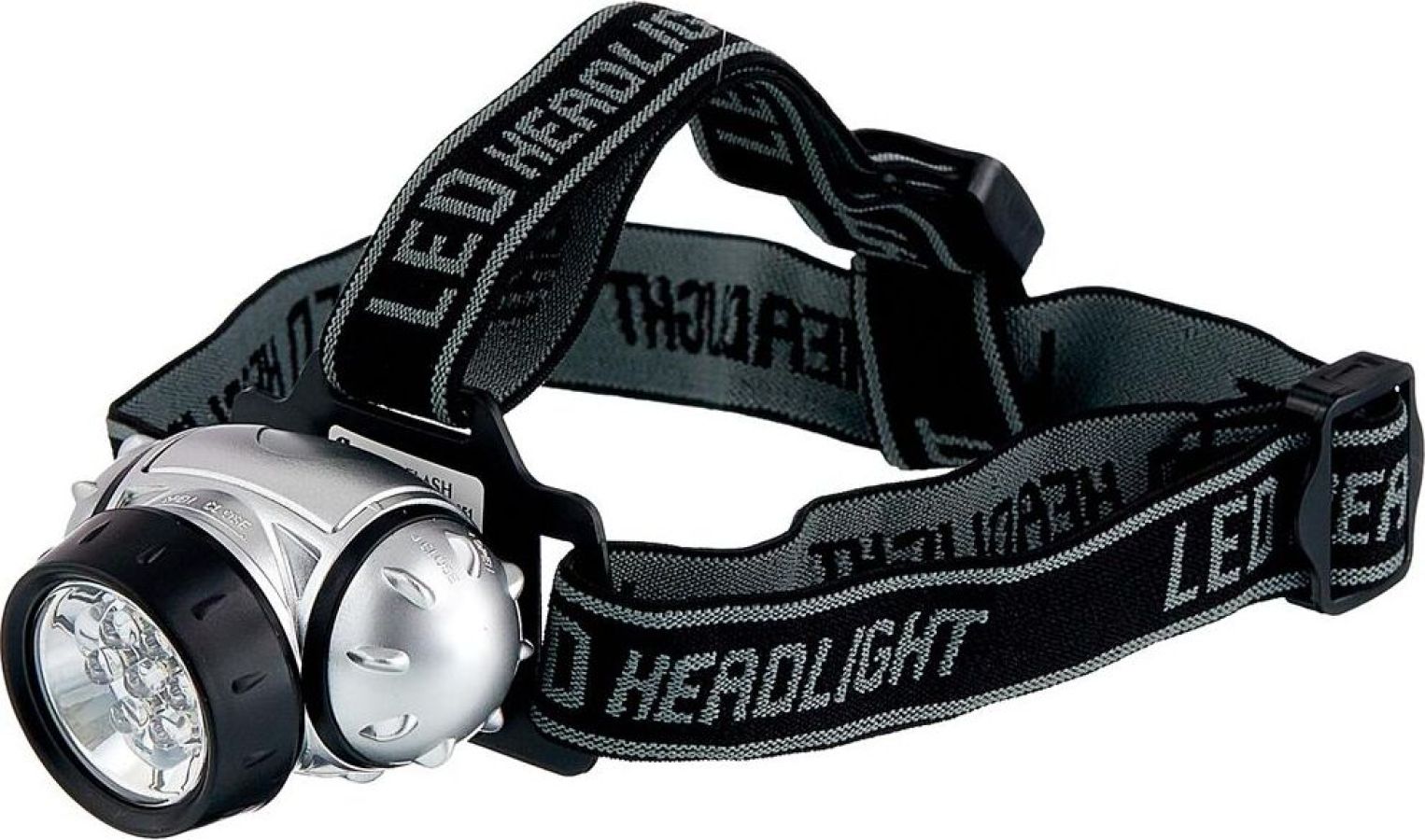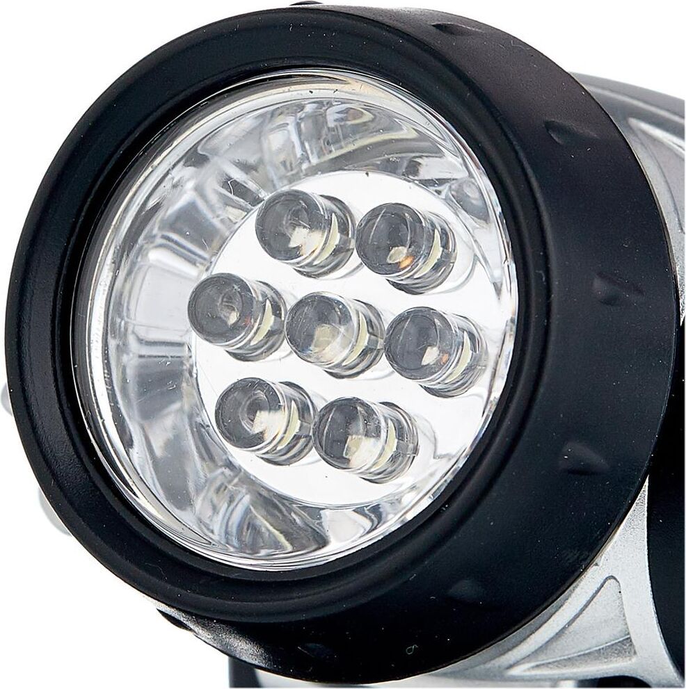 Фонарь электрический светодиодный налобный. Цвет корпуса: серебро + чёрный. Работает от 3 X AAA батареек (не входят в комплект). Материал корпуса - пластик. Источник света - 7 светодиодов с рассеивающими линзами с цветовой температурой 6500К с осевой силой света одного светодиода - 10000 милликанделл, суммарный световой поток 15 люмен. Дистанция освещения - до 20 метров. Три режима работы. Выключатель - трехпозиционный кнопочного типа. Время работы при использовании солевых батареек: 1 светодиод - до 70 часов, 3 светодиода - до 35 часов, 7 светодиодов - до 25 часов. Степень пыле-влаго-защиты IP44.