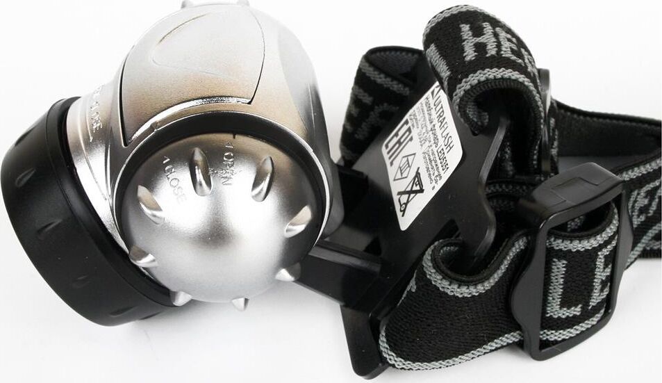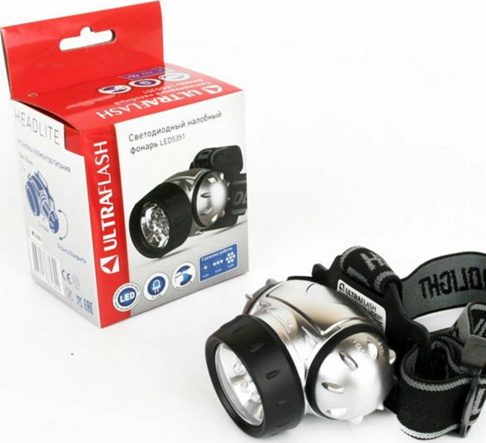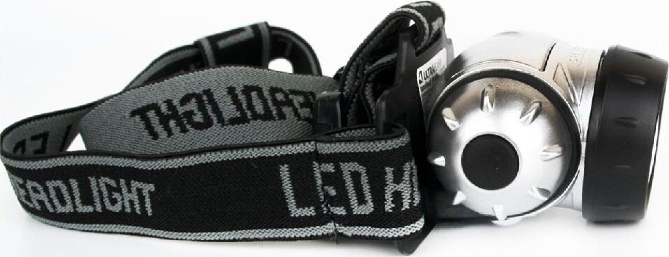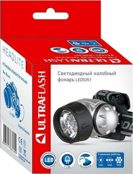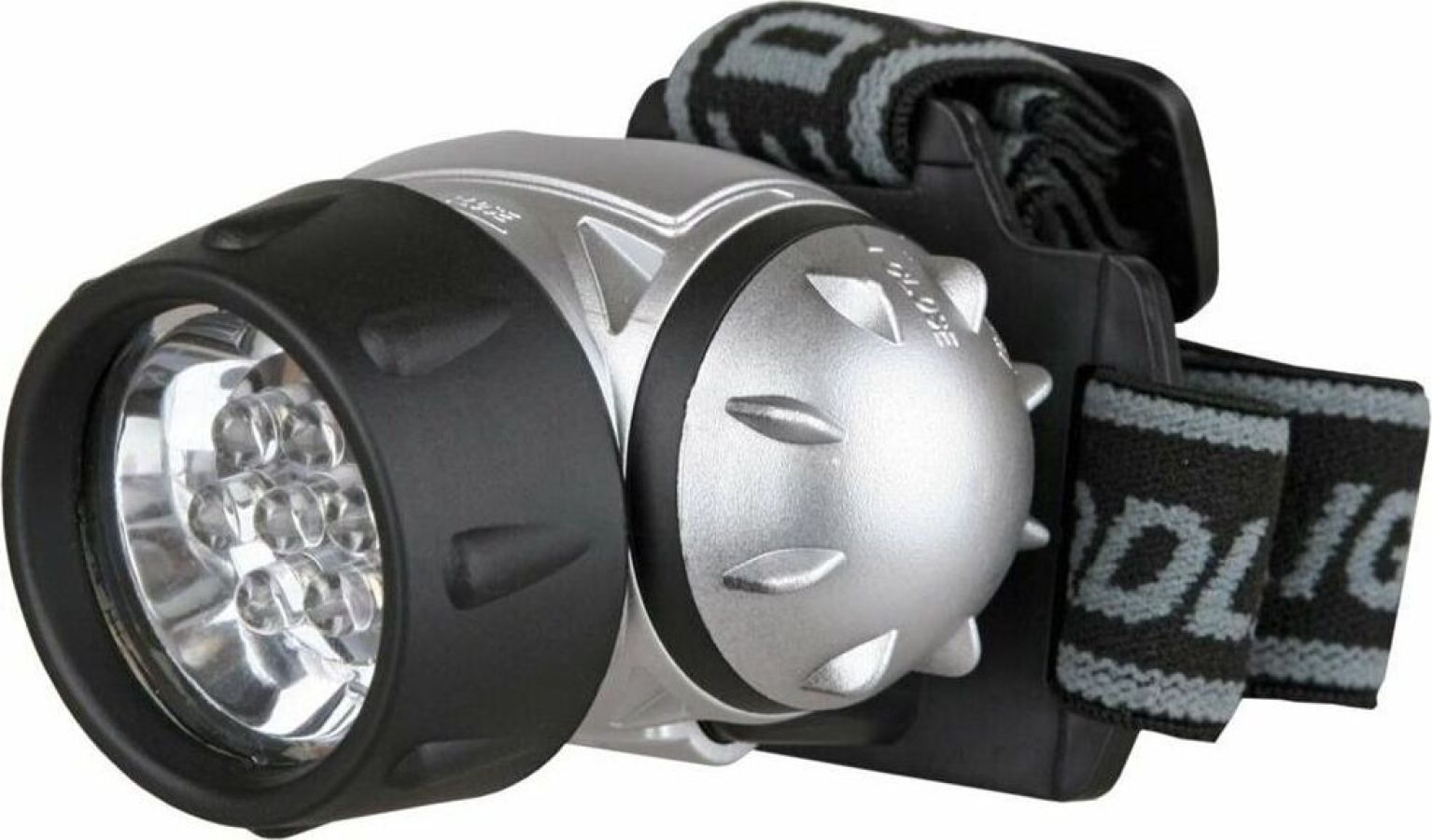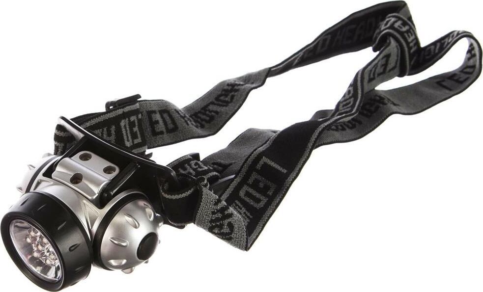 Фонарь электрический светодиодный налобный. Цвет корпуса: серебро + чёрный. Работает от 3 X AAA батареек (не входят в комплект). Материал корпуса - пластик. Источник света - 7 светодиодов с рассеивающими линзами с цветовой температурой 6500К с осевой силой света одного светодиода - 10000 милликанделл, суммарный световой поток 15 люмен. Дистанция освещения - до 20 метров. Три режима работы. Выключатель - трехпозиционный кнопочного типа. Время работы при использовании солевых батареек: 1 светодиод - до 70 часов, 3 светодиода - до 35 часов, 7 светодиодов - до 25 часов. Степень пыле-влаго-защиты IP44.