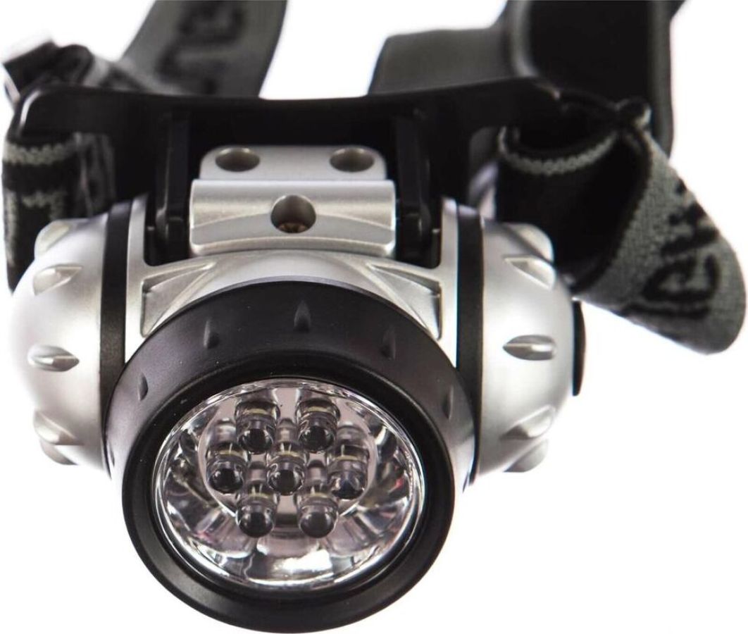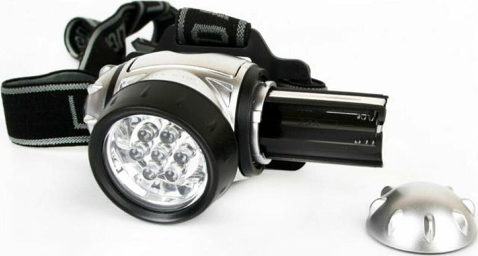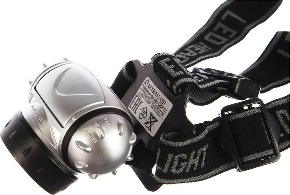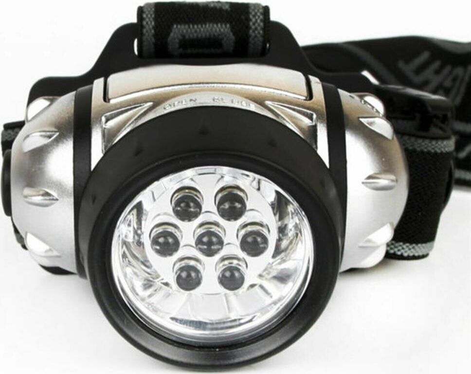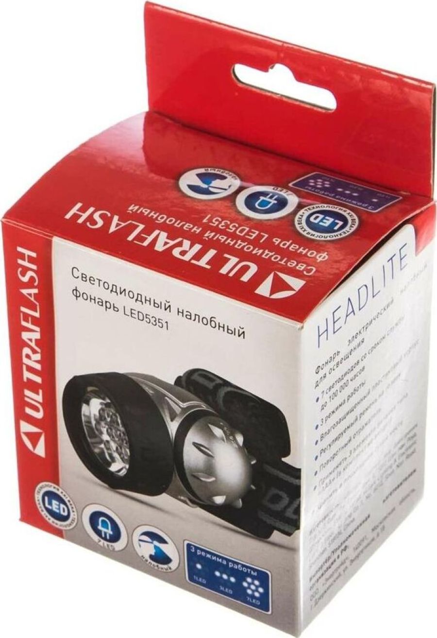 Фонарь электрический светодиодный налобный. Цвет корпуса: серебро + чёрный. Работает от 3 X AAA батареек (не входят в комплект). Материал корпуса - пластик. Источник света - 7 светодиодов с рассеивающими линзами с цветовой температурой 6500К с осевой силой света одного светодиода - 10000 милликанделл, суммарный световой поток 15 люмен. Дистанция освещения - до 20 метров. Три режима работы. Выключатель - трехпозиционный кнопочного типа. Время работы при использовании солевых батареек: 1 светодиод - до 70 часов, 3 светодиода - до 35 часов, 7 светодиодов - до 25 часов. Степень пыле-влаго-защиты IP44.