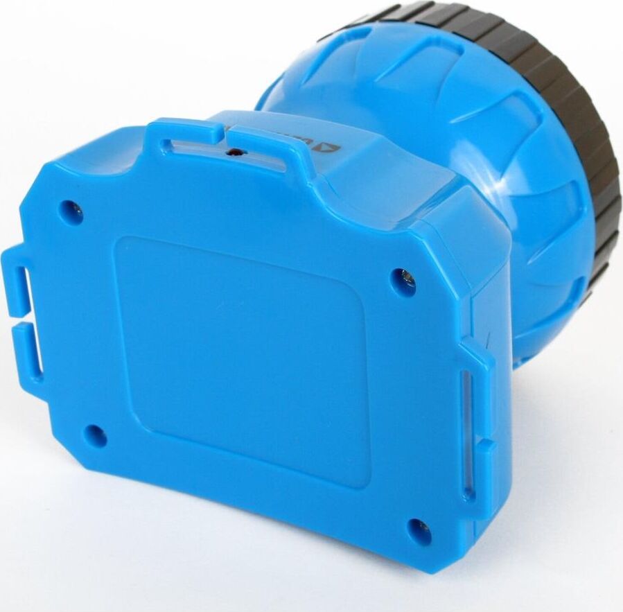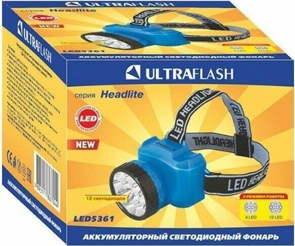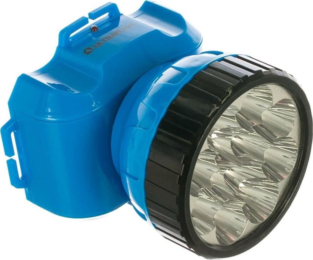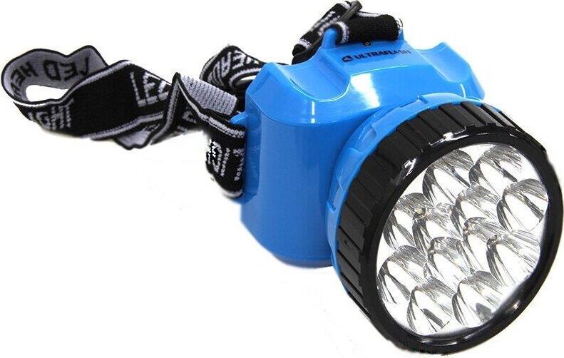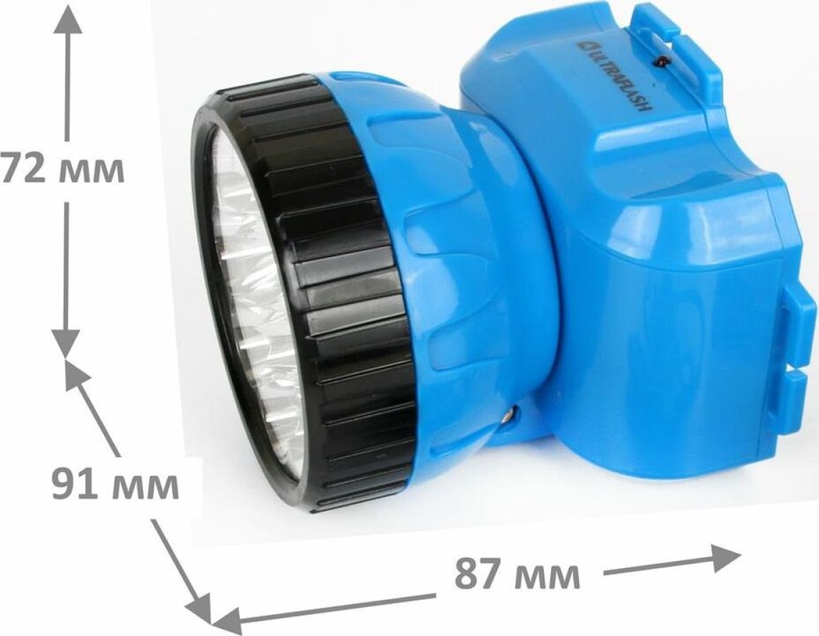 Фонарь Ultraflash электрический светодиодный налобный аккумуляторный. Цвет корпуса: синий с черным. Материал корпуса - пластик. Источники света: 12 светодиода со световым потоком 30 люмен. Дистанция освещения - до 25 метров. Два режима работы. Выключатель: тумблер двухпозиционный. Время работы при полностью заряженном аккумуляторе: 4 светодиода - до 10 часов, 12 светодиодов - до 4 часов. Время заряда - 8 часов. Комплектация: фонарь, свинцово-кислотный аккумулятор с напряжением 4 В емкостью 0,5 А-ч, сетевой кабель для заряда от сети ~220 вольт, поворотный отражатель, эластичный ремешок для ношения на голове, инструкция, упаковка. Степень пыле-влаго-защиты IP22. Упаковка - коробка. Максимальный линейный размер фонаря 8 см. Размер упаковки 8 см x 9 см x 10 см. Вес без упаковки 0,188 кг. Вес с упаковкой 0,232 кг.