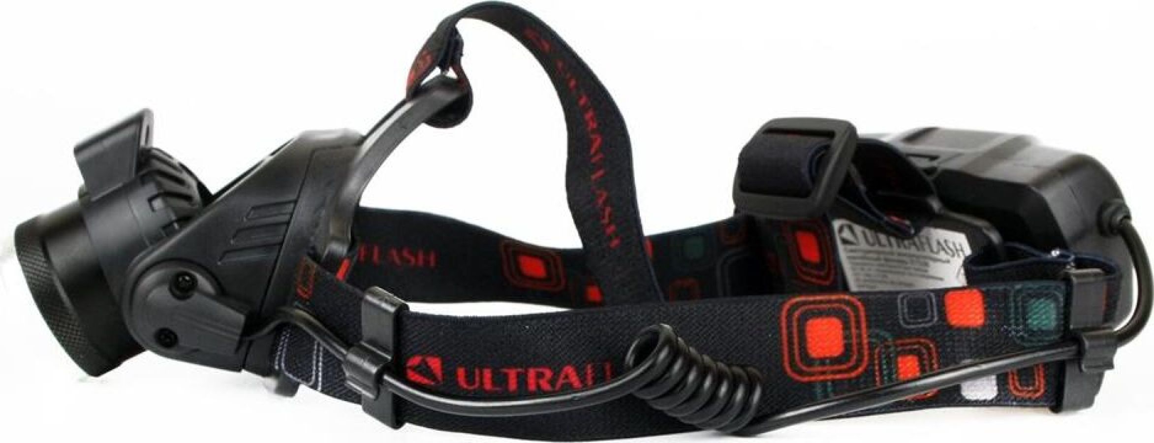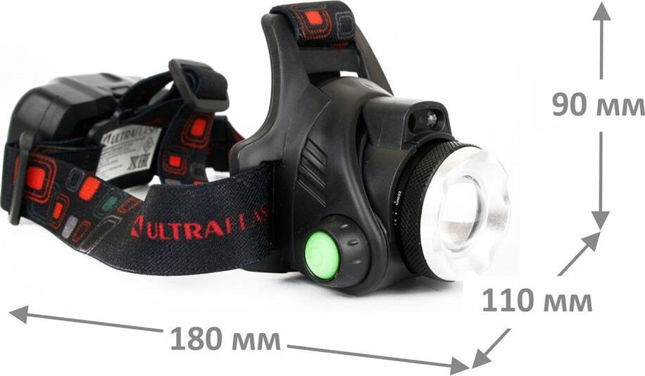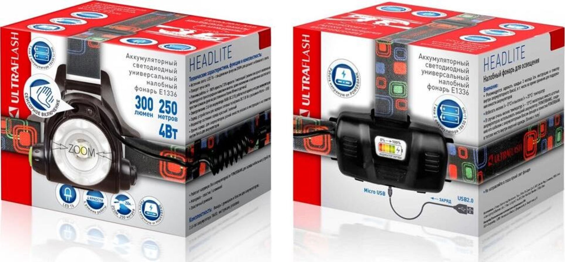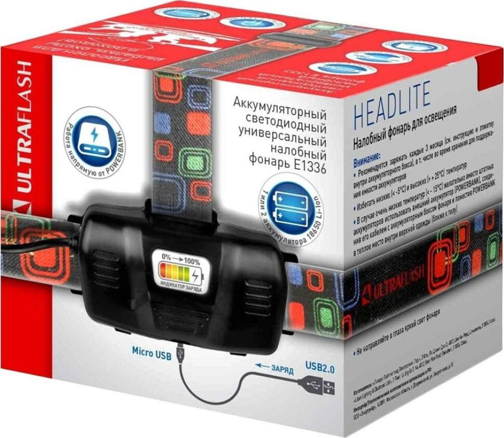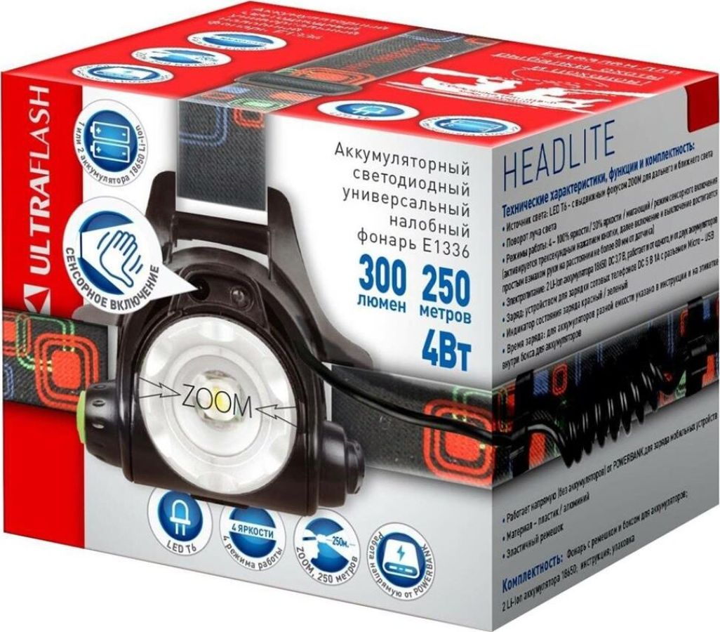 Фонарь Ultraflash электрический светодиодный налобный аккумуляторный. Цвет корпуса: черный. Материал: корпуса фонаря - алюминиевый сплав / пластик. Источник света - светодиод XML-T6 с потребляемой номинальной мощностью 4 Вт, световой поток до 300 люмен. Дистанция освещения - до 250 метров. Регулируемый фокус (ZOOM). 3 режима работы - 100% яркости / 30% яркости / мигалка. Возможность работы и от одного, и от двух аккумуляторов. Возможность работы напрямую от Powerbank через вход Micro USB. Индикатор заряда, меняющий цвет при окончании заряда. Выключатель: четырехпозиционный кнопочный. Режим работы, когда включение / выключение регулируется пироэлектрическим сеносром движения. Время работы при полностью заряженном аккумуляторе (для емкости 1200 мА-ч): : в режиме 100% - до 3,5 часов, в режиме 30% - до 10 часов, мигающий режим - до 5,8 часов. Заряд через вход Micro USB при помощи распространенных зарядных устройств для телефонов с Андроидом. Время заряда (ток заряда 1А, аккумуляторы 1200 мА-ч) - 6 часов. Комплект