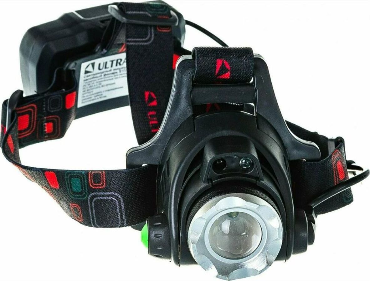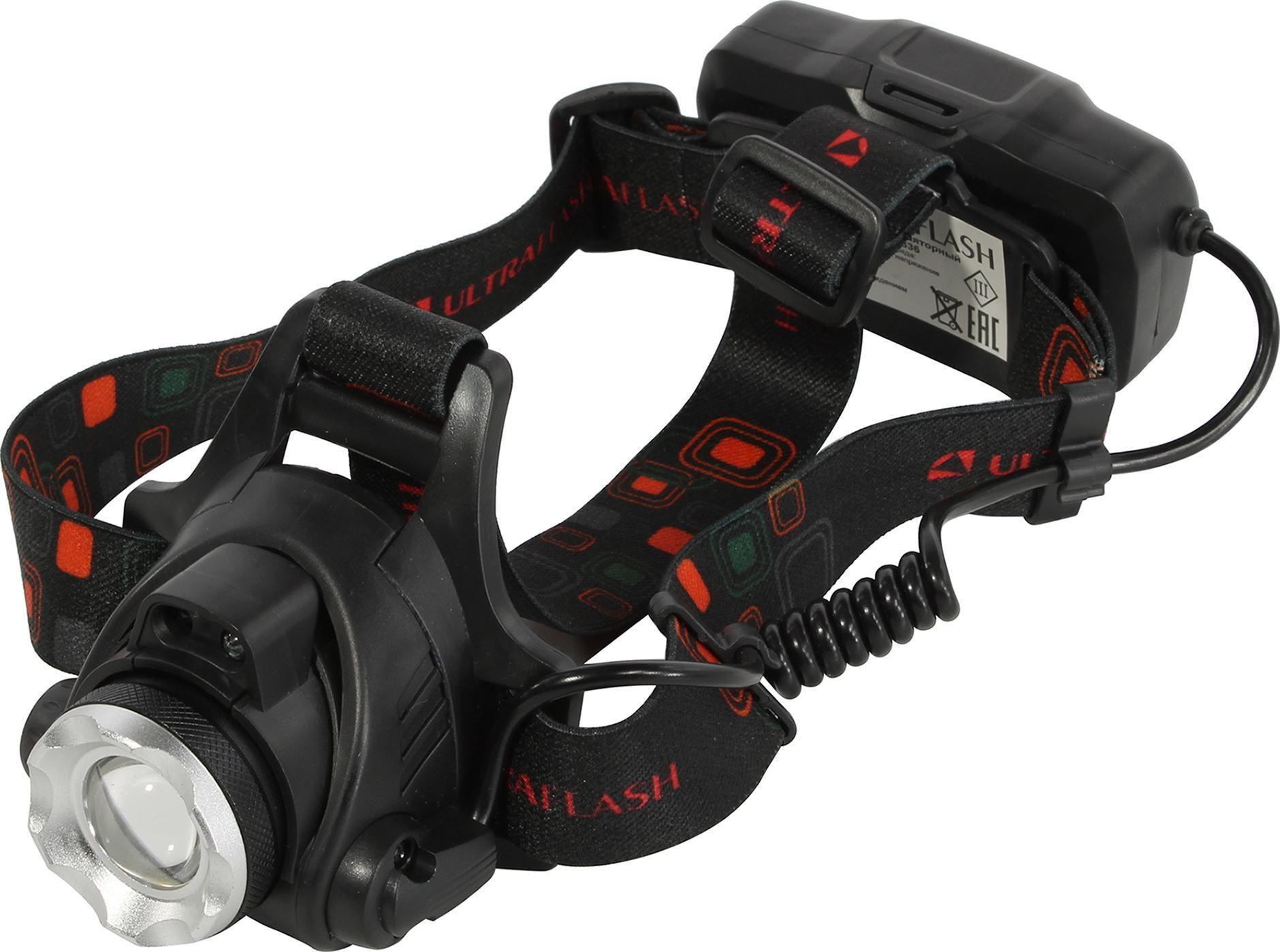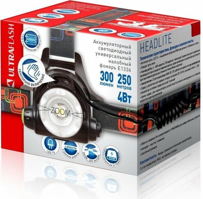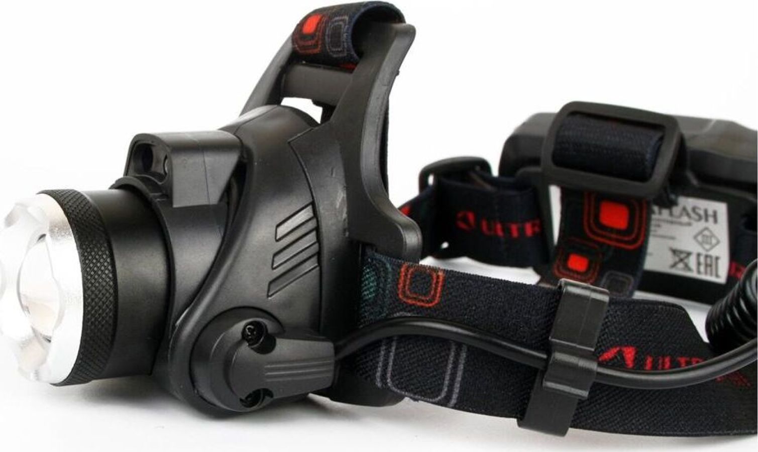 Фонарь Ultraflash электрический светодиодный налобный аккумуляторный. Цвет корпуса: черный. Материал: корпуса фонаря - алюминиевый сплав / пластик. Источник света - светодиод XML-T6 с потребляемой номинальной мощностью 4 Вт, световой поток до 300 люмен. Дистанция освещения - до 250 метров. Регулируемый фокус (ZOOM). 3 режима работы - 100% яркости / 30% яркости / мигалка. Возможность работы и от одного, и от двух аккумуляторов. Возможность работы напрямую от Powerbank через вход Micro USB. Индикатор заряда, меняющий цвет при окончании заряда. Выключатель: четырехпозиционный кнопочный. Режим работы, когда включение / выключение регулируется пироэлектрическим сеносром движения. Время работы при полностью заряженном аккумуляторе (для емкости 1200 мА-ч): : в режиме 100% - до 3,5 часов, в режиме 30% - до 10 часов, мигающий режим - до 5,8 часов. Заряд через вход Micro USB при помощи распространенных зарядных устройств для телефонов с Андроидом. Время заряда (ток заряда 1А, аккумуляторы 1200 мА-ч) - 6 часов. Комплект