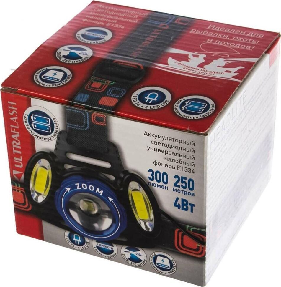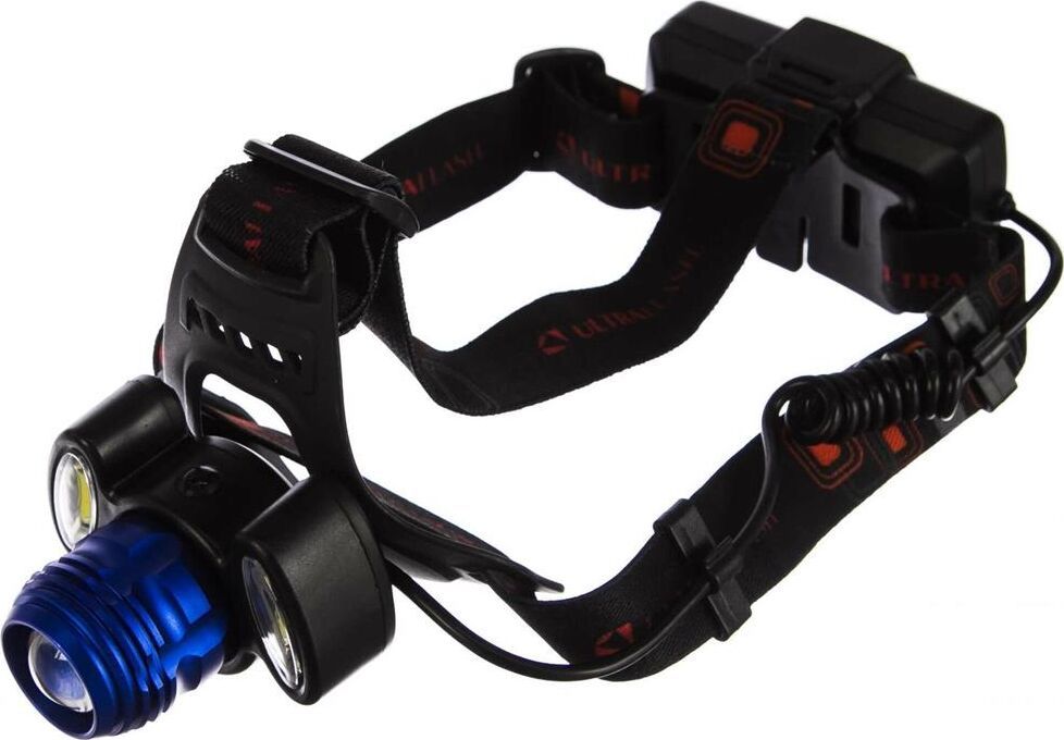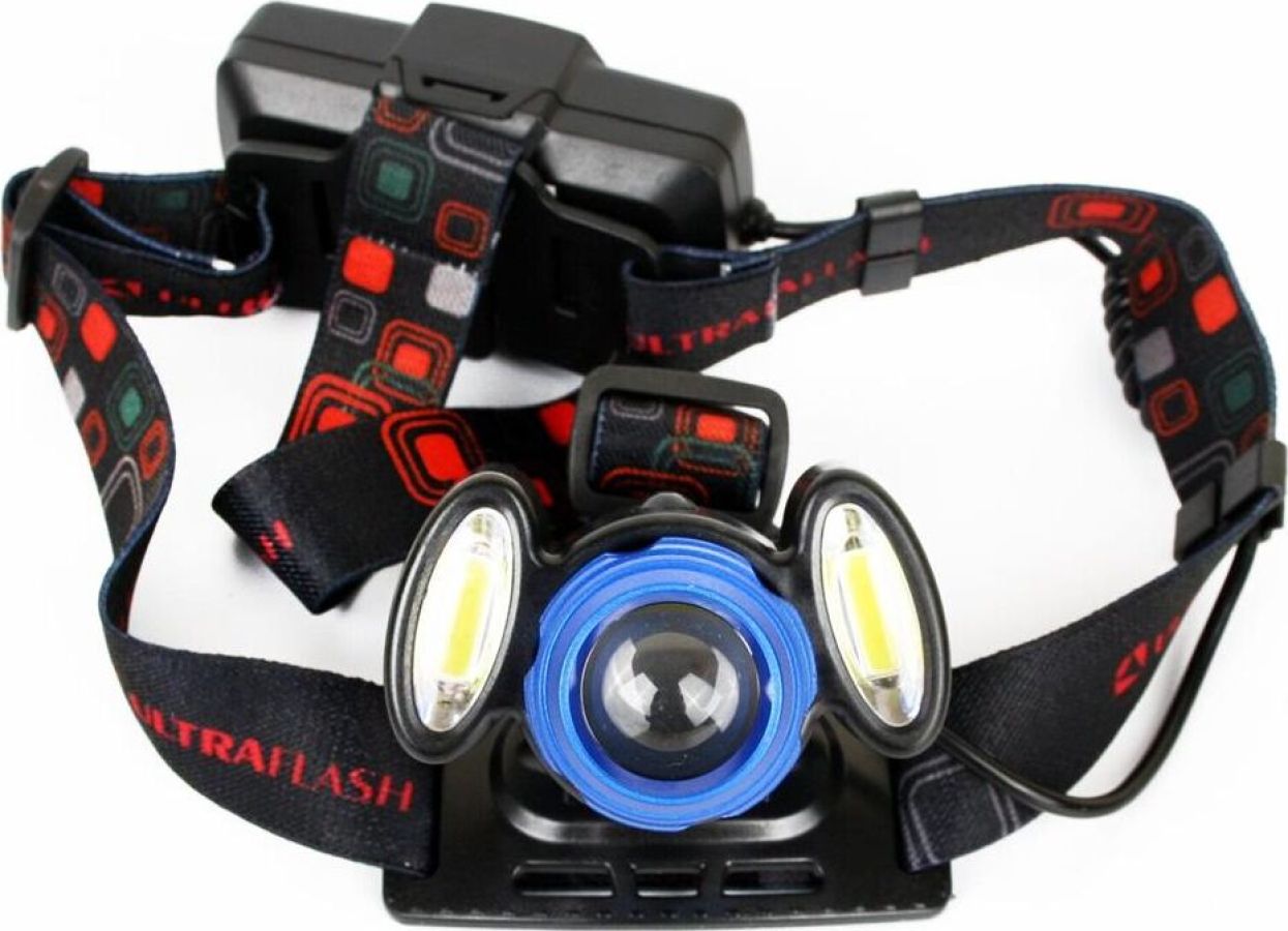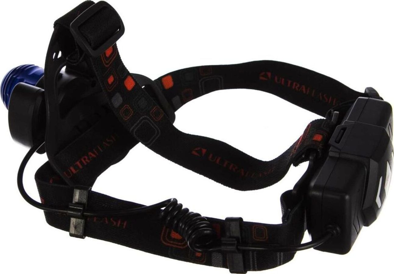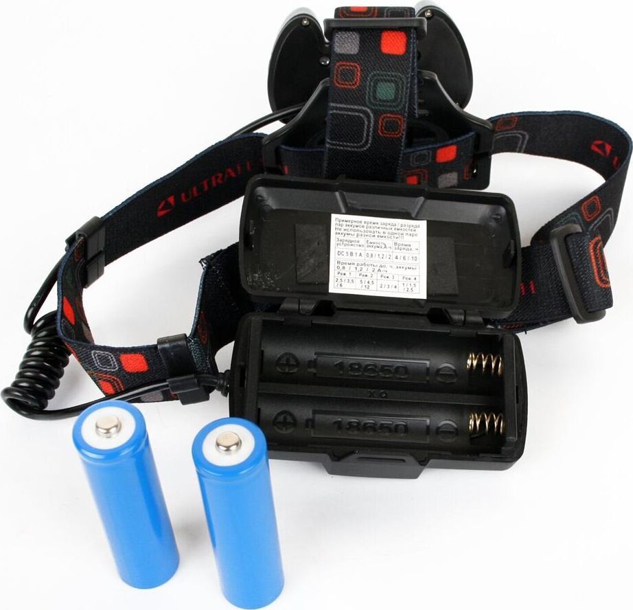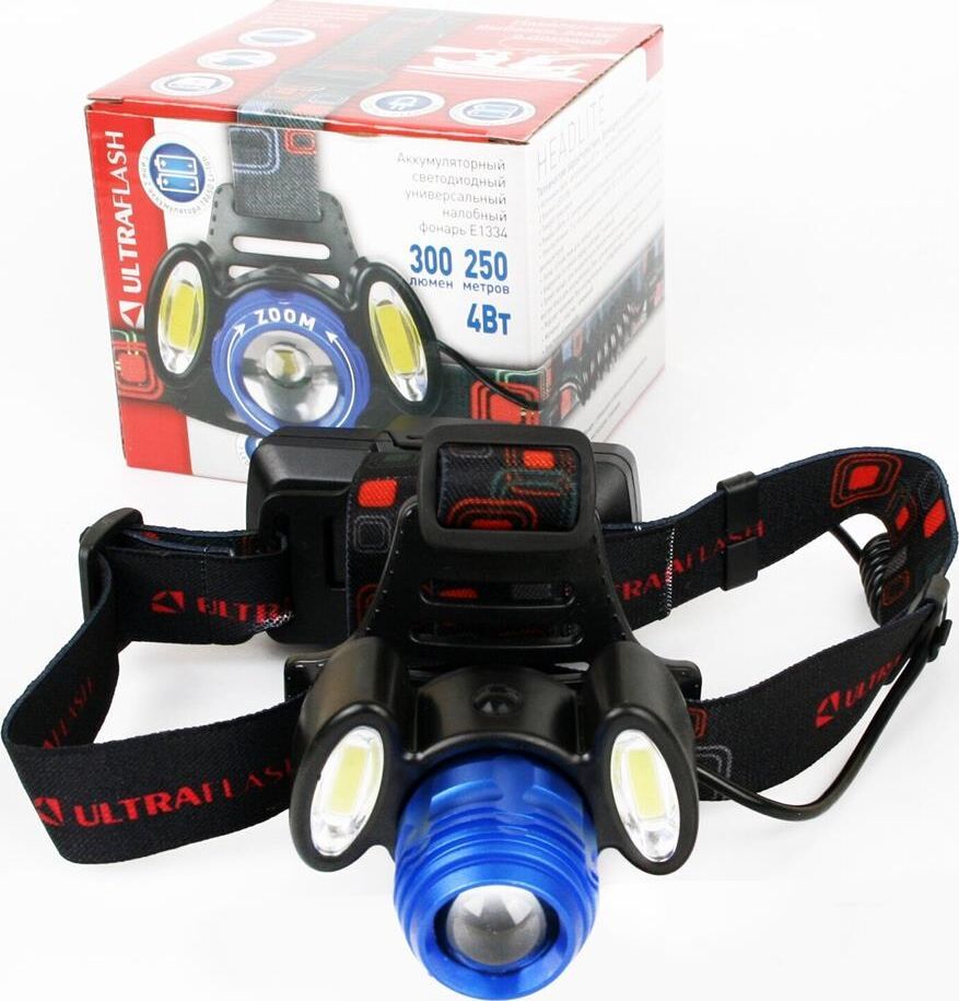 Фонарь Ultraflash электрический светодиодный налобный аккумуляторный. Цвет корпуса: синий / черный. Материал: корпуса фонаря - алюминиевый сплав / пластик. Источники света - светодиод XML-T6 с потребляемой номинальной мощностью 4 Вт, 2 светодиода типа COB с потребляемой мощностью 2 Вт. световой поток до 300 люмен. Дистанция освещения - до 250 метров. Регулируемый фокус (ZOOM). 4 режима работы - XML-T6 / 2 боковых COB LED / все LED BOOST / мигалка. Возможность работы и от одного, и от двух аккумуляторов. Возможность работы напрямую от Powerbank через вход Micro USB. Индикатор заряда, меняющий цвет при окончании заряда. Выключатель: четырехпозиционный кнопочный. Время работы при полностью заряженном аккумуляторе (для емкости 1200 мА-ч): : в режиме XML-T6 - до 3,5 часов, в режиме 2 X COB - до 4,5 часов, все LED - до 3 часов, мигающий режим - до 1,5 часов. Заряд через вход Micro USB при помощи распространенных зарядных устройств для телефонов с Андроидом. Время заряда (ток заряда 1А, аккумуляторы 1200 мА-ч) - 6 ч