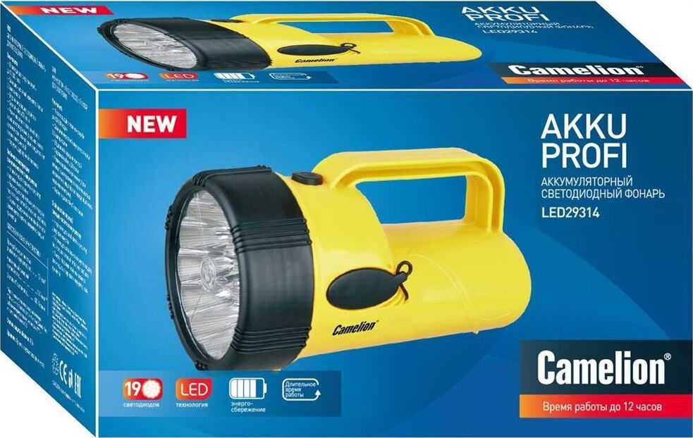 Camelion LED29314 (фонарь аккум. 220В, желтый, 19 LED, 4В 2,3А-ч, пластик, коробка)