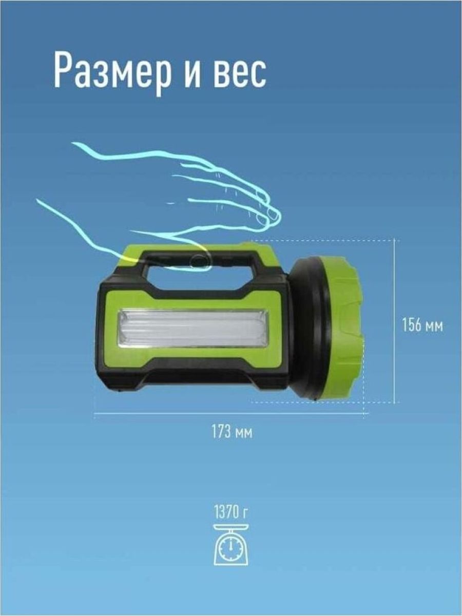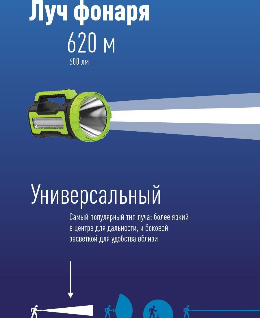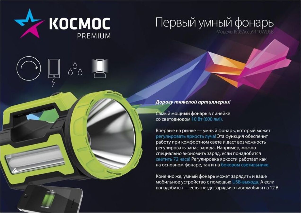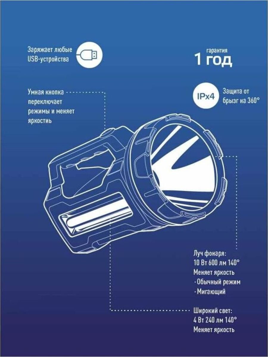 УМНЫЙ МОЩНЫЙ ФОНАРЬ со светодиодом 10 Ватт 600 лм, который может регулировать яркость луча Эта функция обеспечит работу при комфортном свете и даст возможность регулировать запас заряда. Например, можно специально экономить заряд, если понадобится светить 72 часа. Регулировка яркости работает как на основном фонаре, так и на боковом светильнике мощностью 240 лм. Дальность луча фонаря 620 метров. Широкий свет осветит 29 кв.м.. Умный фонарь может зарядить и Ваше мобильное устройство с помощью USB-выхода. Гнездо зарядки от автомобиля на 12В. Ударопрочный. Влагостойкий корпус