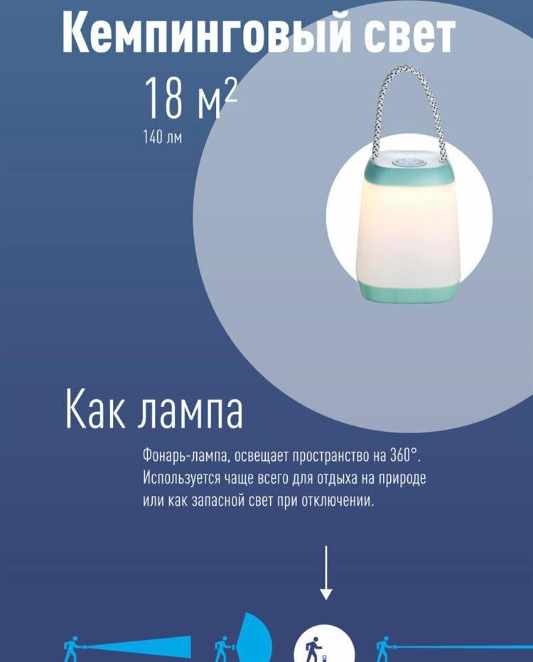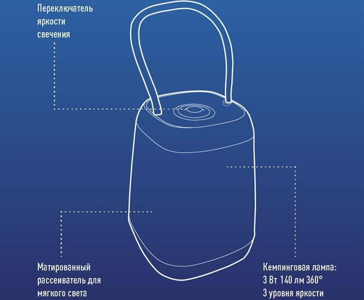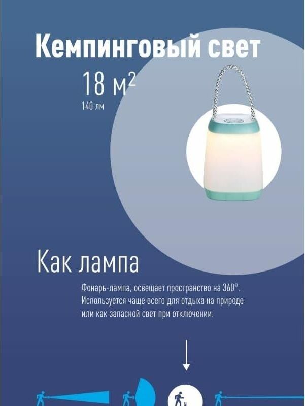 Кемпинговый фонарик с мягким тёплым светом. Впишется в атмосферу отдыха, отлично подойдёт для пикника или на стол веранды. Может использоваться как детский ночник.Три уровня яркости для создания подходящей атмосферы отдыха. 3W 3xAA ,время работы мах.15ч.