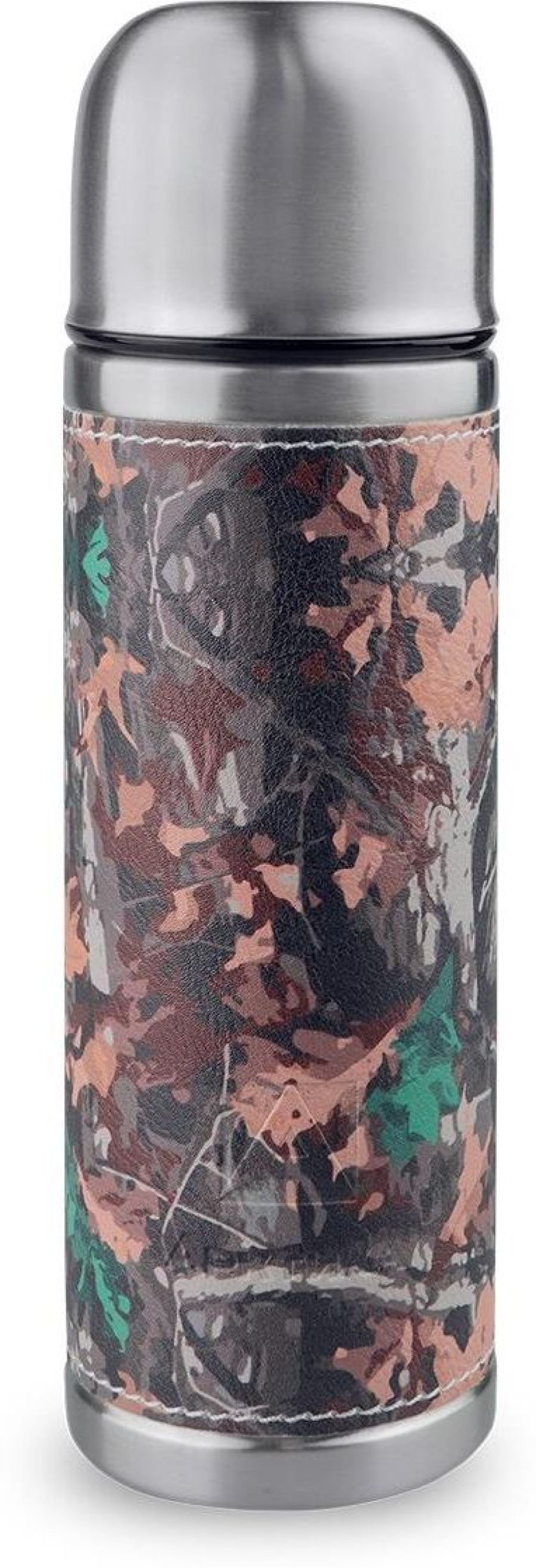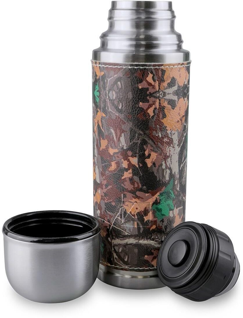 Термос для напитков, пробка с кнопкой, с кожаной вставкой на корпусе. Объем 0,5л.