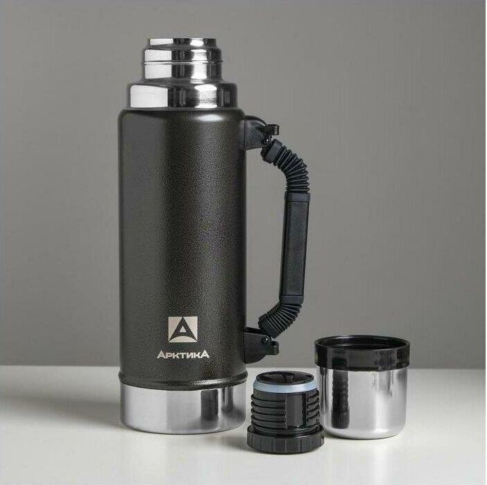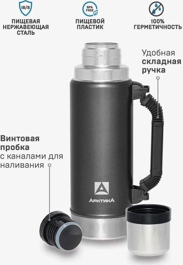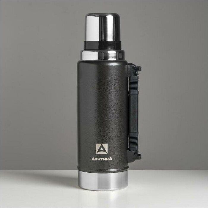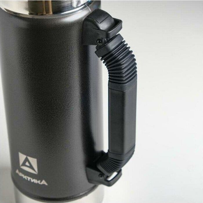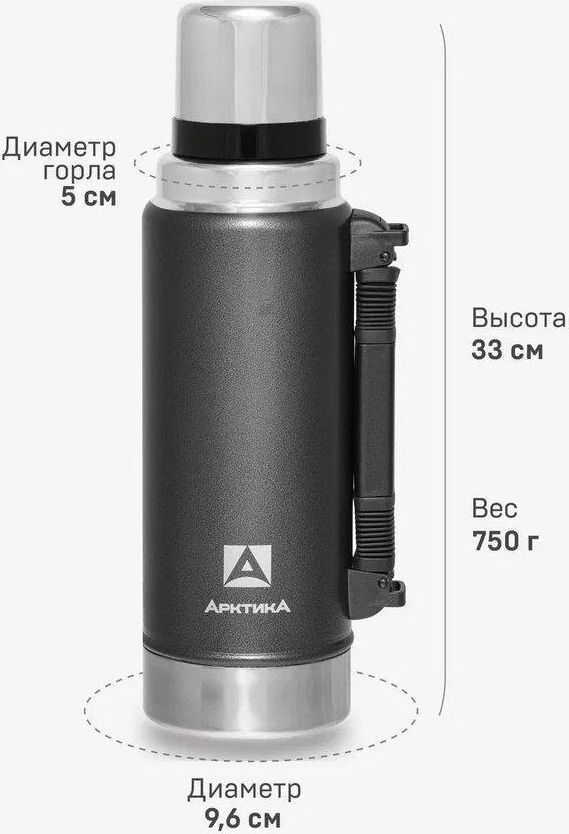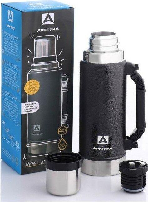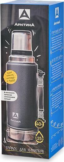 АРКТИКА 1.25 л, 106-1250P (чёрный) ип Термос Описание Термос вакуумный с глухой пробкой и ручкой 1250 мл. Покрытие из молотковой эмали дополнительно защищает термос от сколов и царапин. Объем 1.25 л Время удержания тепла 40 ч Тип теплоизоляции вакуум Тип пробки винтовая Тип горловины узкая Чехол в комплекте отсутствует Крышка-чашка есть Количество крышек-чашек 1 шт Цвет зеленый Материал корпуса нержавеющая сталь Материал колбы нержавеющая сталь Материал ручки пластик Размеры 96.2 х 330 х 96.2 мм Вес 890 грамм Тип упаковки картонная коробка