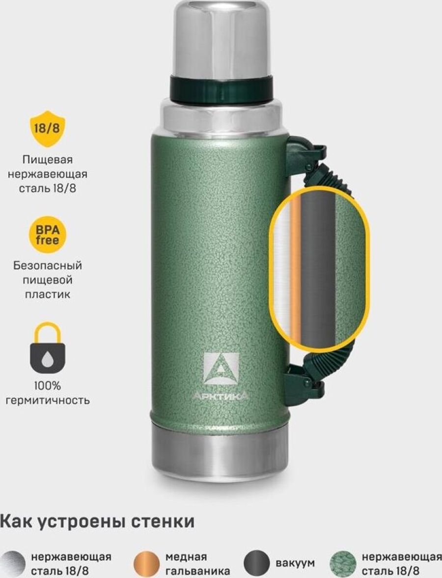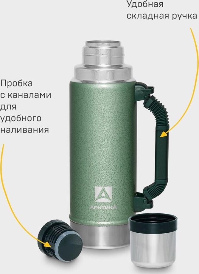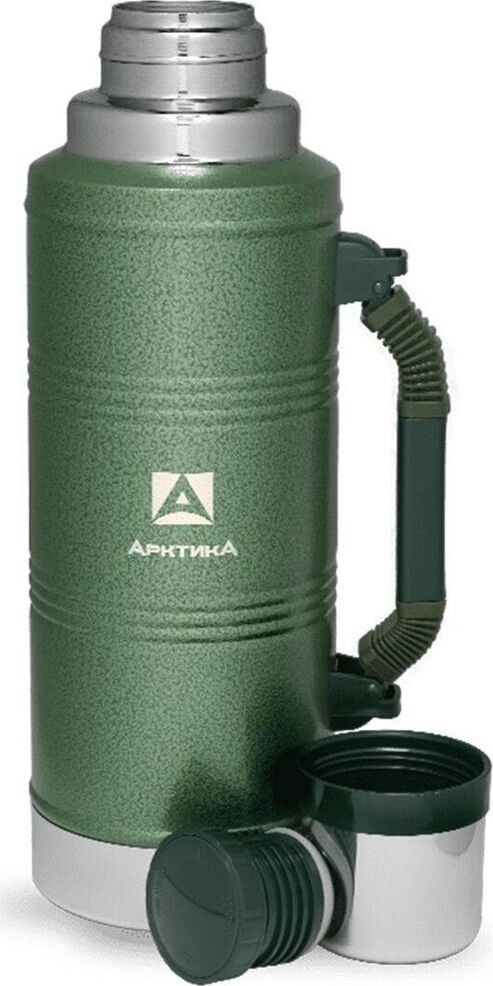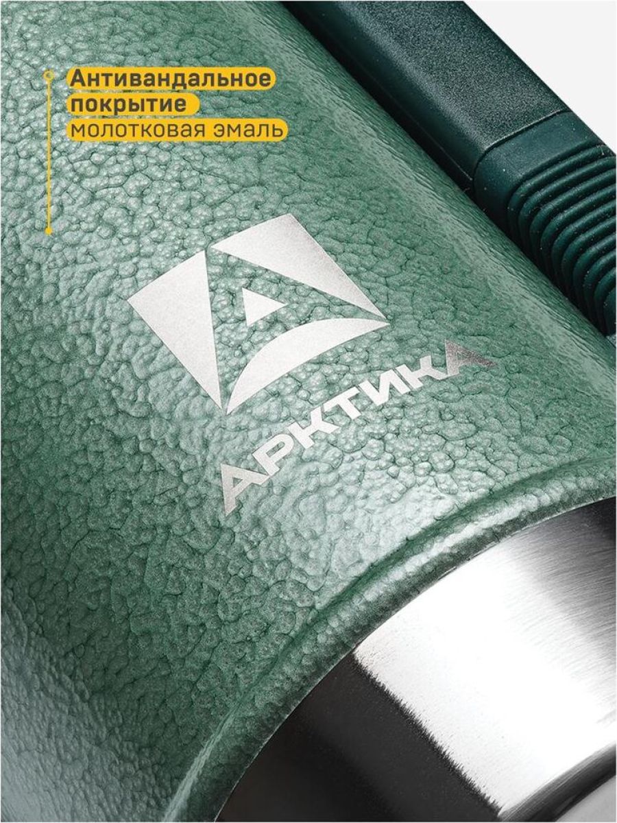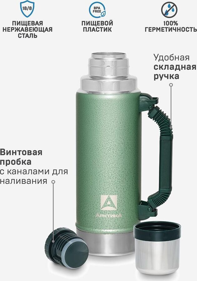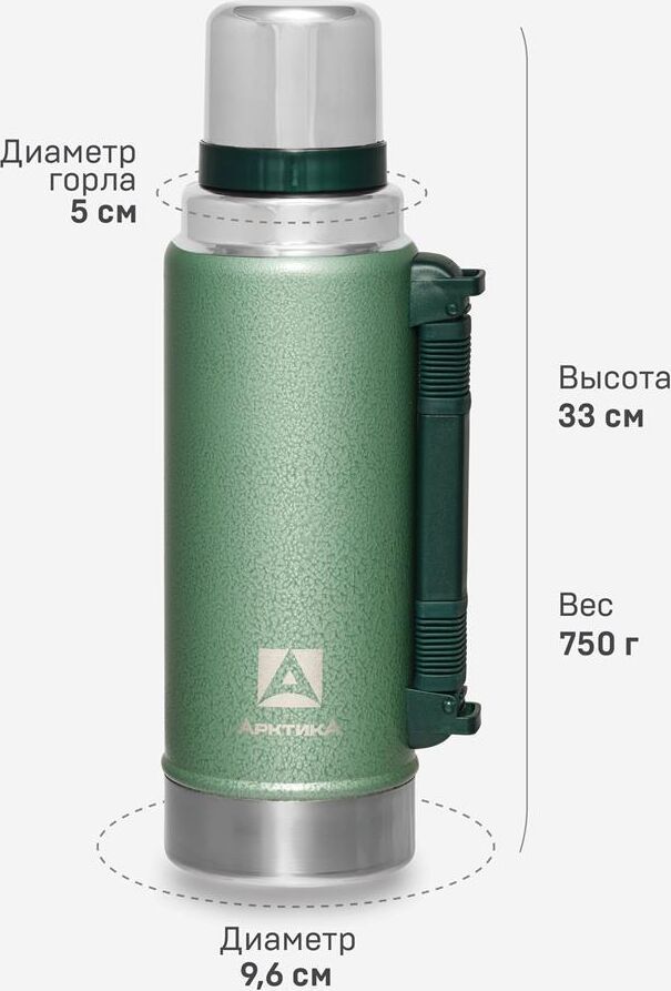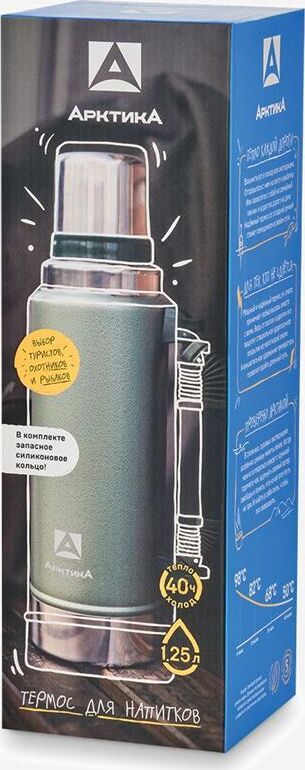 АРКТИКА 1.25 л, 106-1250P (зеленый) ип Термос Описание Термос вакуумный с глухой пробкой и ручкой 1250 мл. Покрытие из молотковой эмали дополнительно защищает термос от сколов и царапин. Объем 1.25 л Время удержания тепла 40 ч Тип теплоизоляции вакуум Тип пробки винтовая Тип горловины узкая Чехол в комплекте отсутствует Крышка-чашка есть Количество крышек-чашек 1 шт Цвет зеленый Материал корпуса нержавеющая сталь Материал колбы нержавеющая сталь Материал ручки пластик Размеры 96.2 х 330 х 96.2 мм Вес 890 грамм Тип упаковки картонная коробка