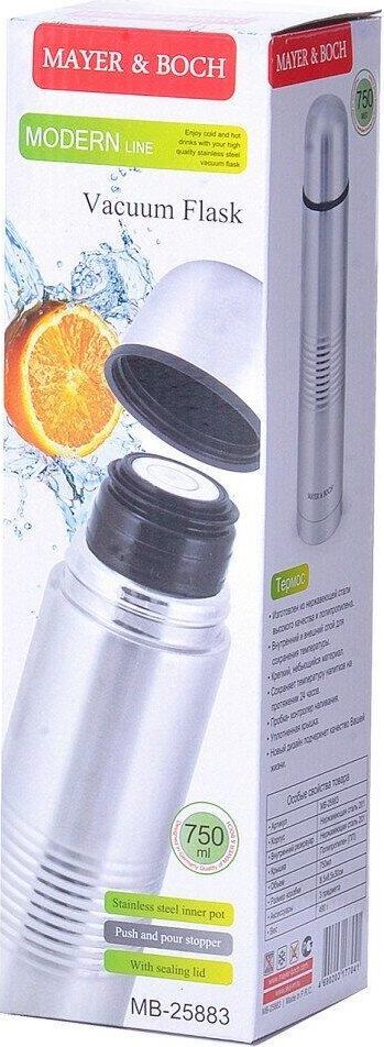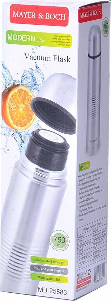 Термос МВ (х24). Корпус: нержавеющая сталь. Внутренняя колба: нержавеющая сталь. Крышка: полипропилен. Цвет: серебристый. Диаметр горлышка: 4,5 см. Объем: 750 мл. Размер упаковки: 8,5 х 8,5 х 30 см. Упаковка: коробка. Вес: 490 г. Страна-изготовитель: Китай.