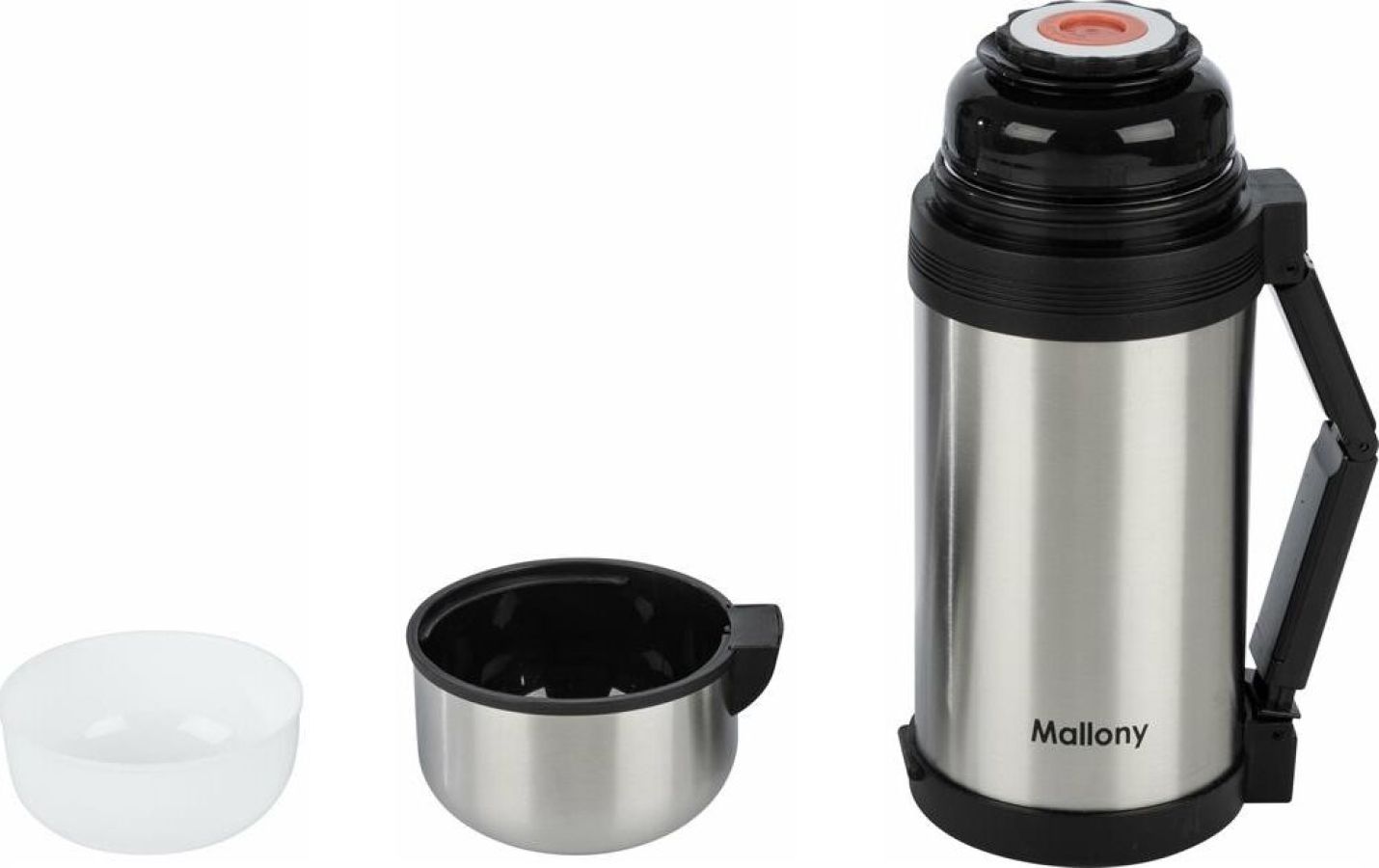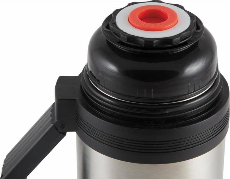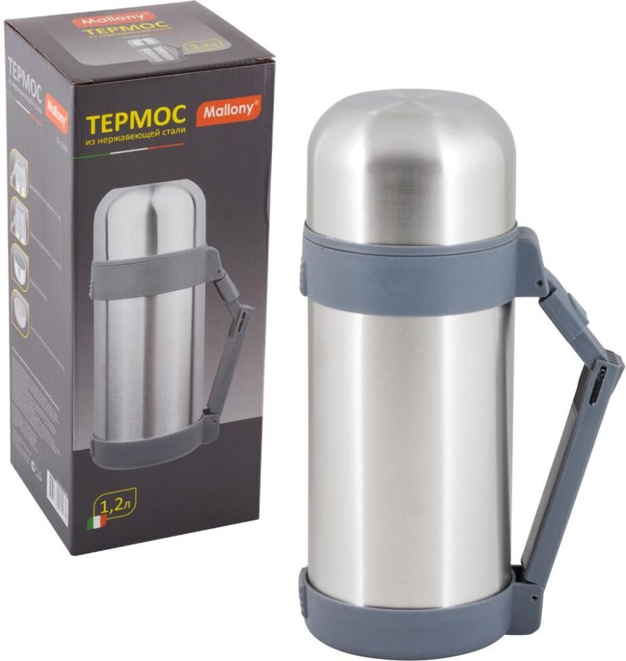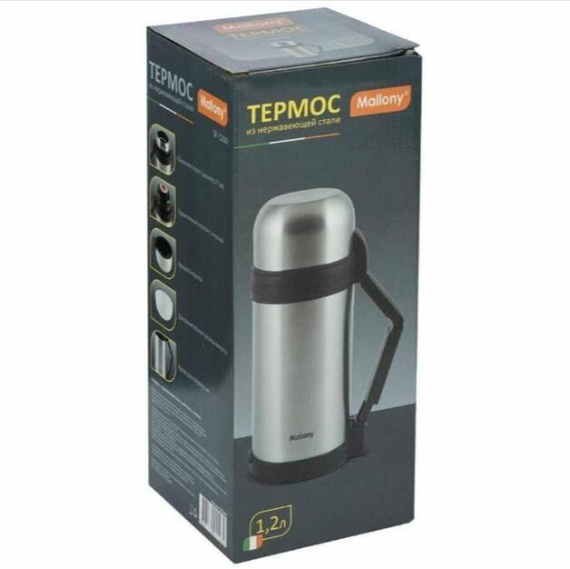 Объем: 1,20 л. Материал: нерж. сталь (201), пластмасса, резин. уплотнитель - Широкое горло (диам. 7см.) - Герметичный клапан (пробка) с кнопкой. Простым нажатием, не отвинчивая пробку, удобно наливать напитки. - Выдвижная эргономичная ручка для удобства переноски - Крышка – кружка - Дополнительная кружка - Ремешок для переноски Термос предназначен для хранения горячих и холодных напитков, супов и других жидкостей. Упаковка: цветная картонная коробка