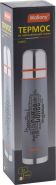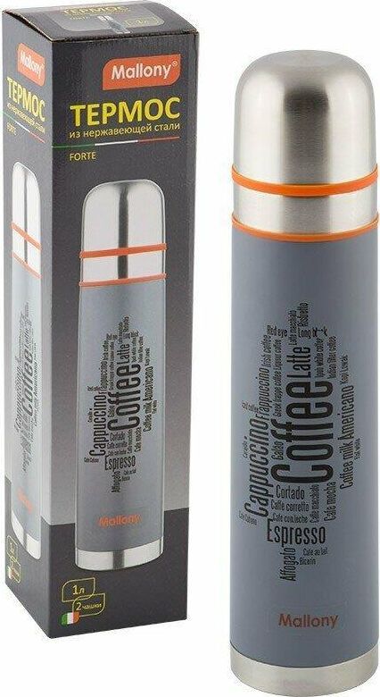 Колба и корпус из нержавеющей стали с двойными стенками. Герметичный клапан (пробка) с кнопкой. В комплекте 2 чашки. Упаковка - картонная коробка