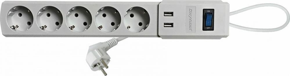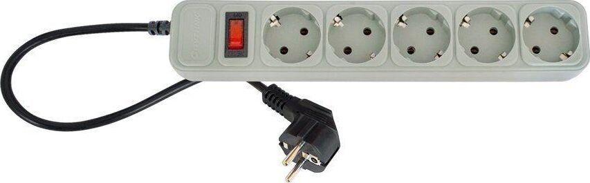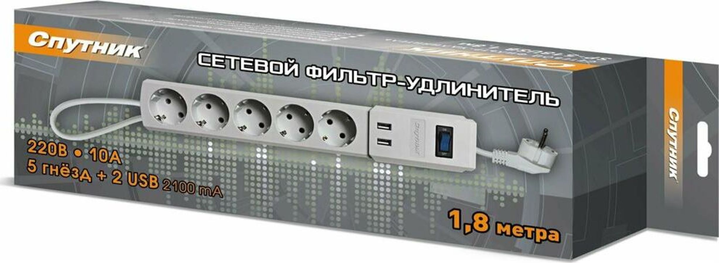 Трёхжильный кабель ПВС, сечение 0,75 мм2, заземление, номинальное напряжение: 220 В, рабочая частота: 50-60 Гц, сила тока: 10 А, макс. мощность нагрузки: 2200 W (2,2 кВт), 5 гнезд, длина кабеля: 1,8 м, материал: пластик ABS, индивидуальная цветная коробка
