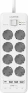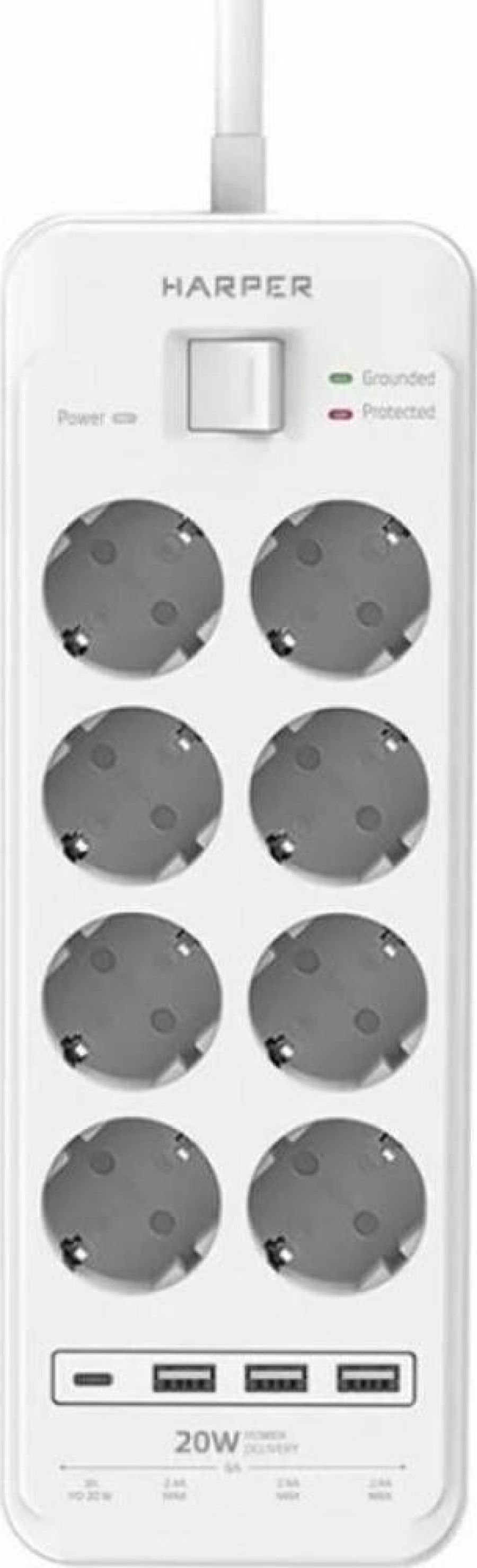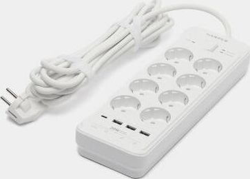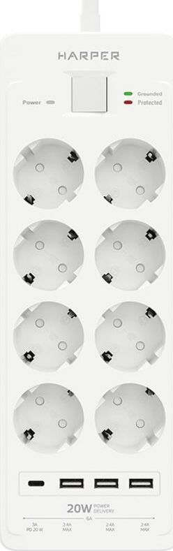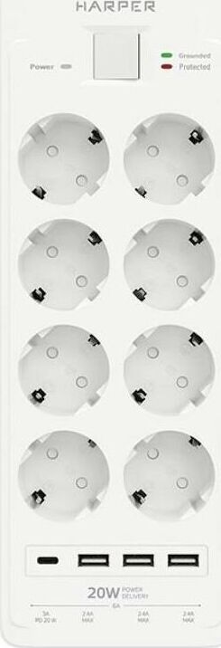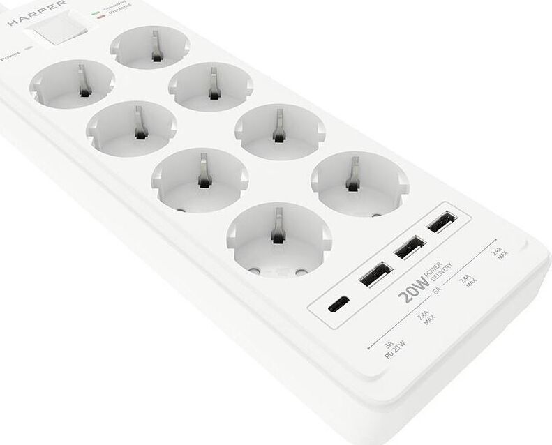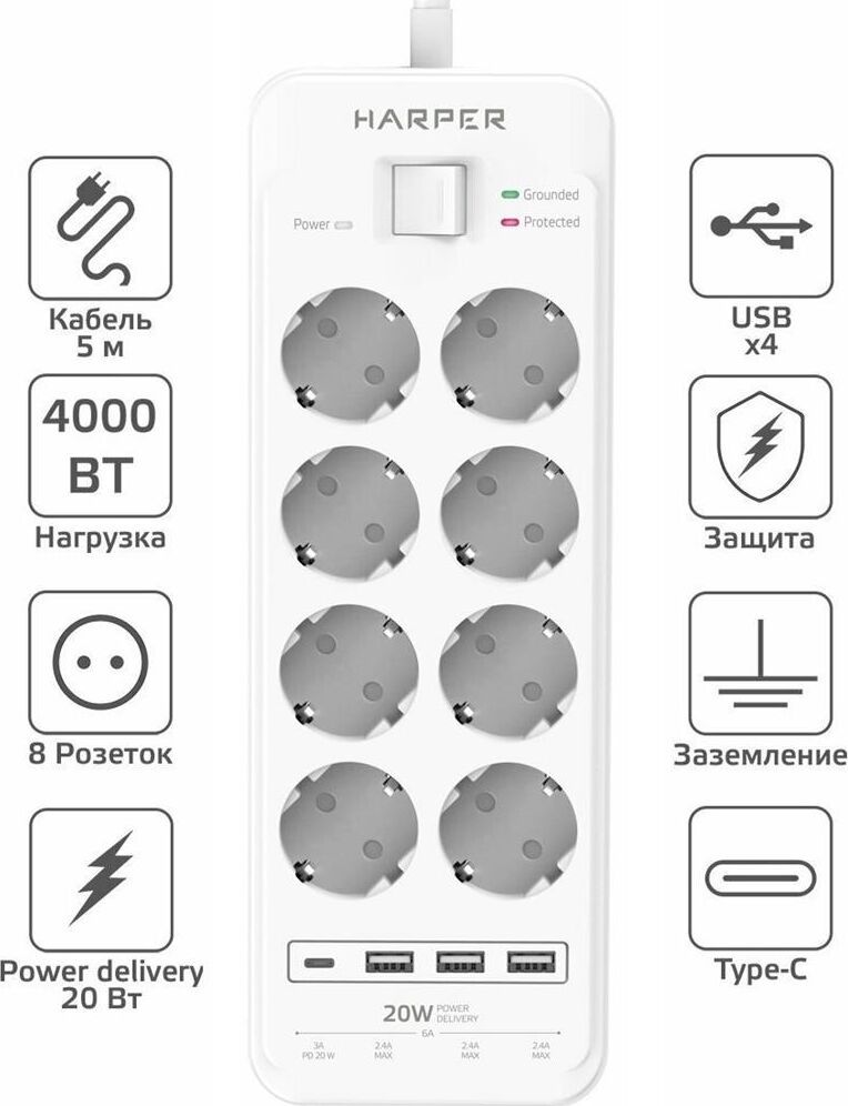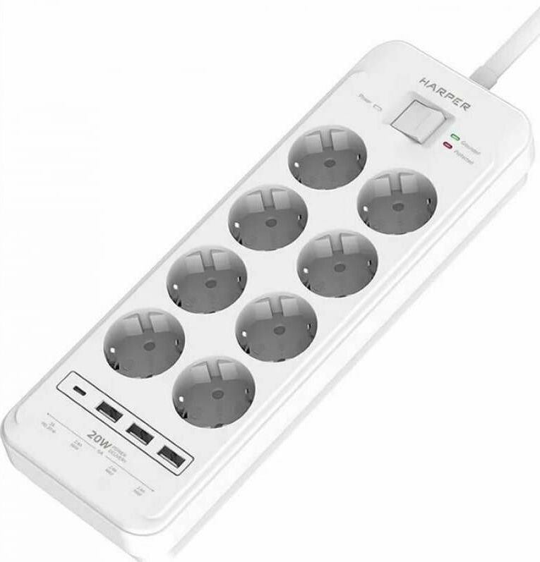 Удлинитель с 3xUSB+1xType-C (Power Delivery 20Вт) портами; Розетки 8шт; Длина кабеля 5.0 метров; Максимальная мощность 4000W (16A); 3xUSB, 1xType-C (Максимальная суммарная сила тока: 6.0 А); Выключатель с защитой от перегрузок; Защитные шторки, Индикатор заземления, Индикатор работы; Индикатор защиты от перепада напряжения; Отверстия для крепления на стену; Стильный лаконичный дизайн; Высококачественный пластик; Питание AC 220-250V 50Hz. Вес: 1150 гр.; Габариты 297х104х40 мм.