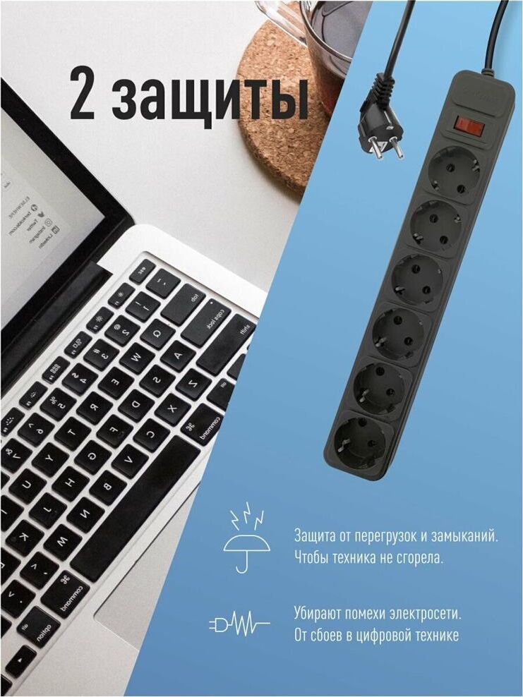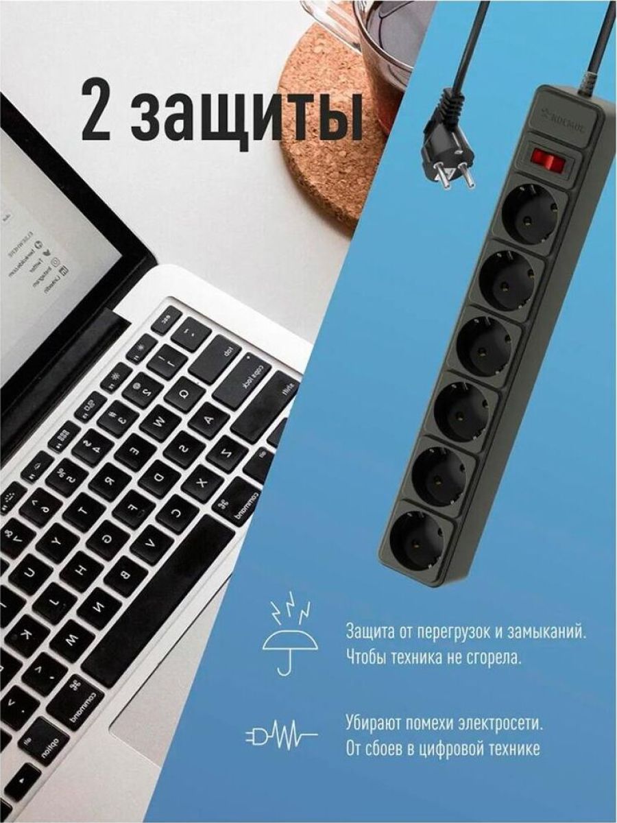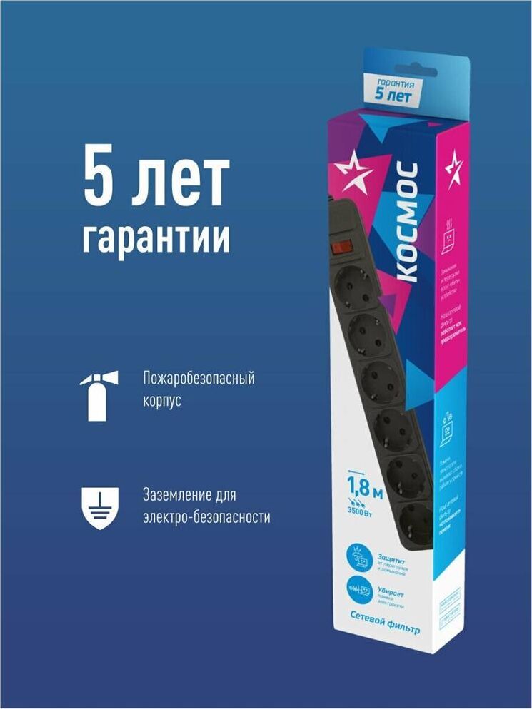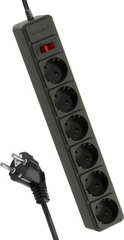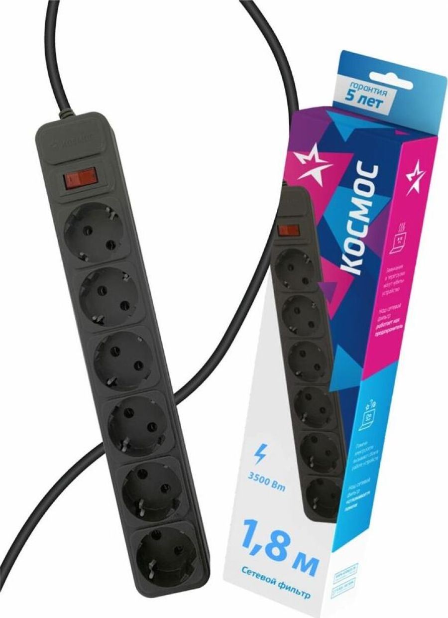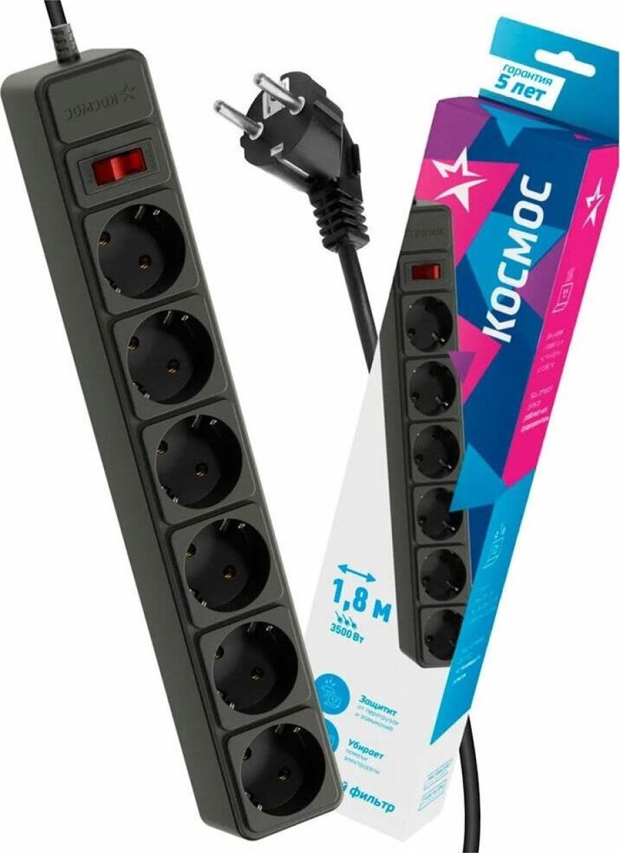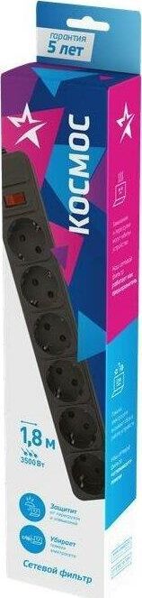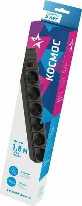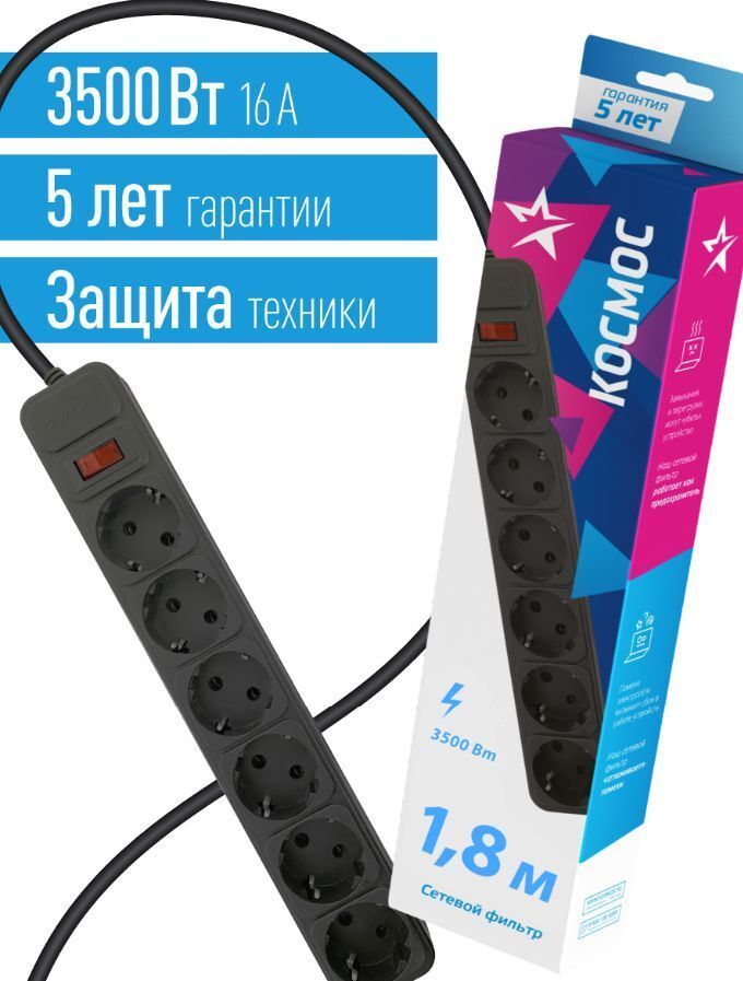 Сетевой фильтр, количество розеток - 6, номинальный ток 16А. 220В, защита от многоразовых перегрузок и замыканий, максимальная мощность 3500 Вт. длина кабеля - 1,8 м, цвет - черный.