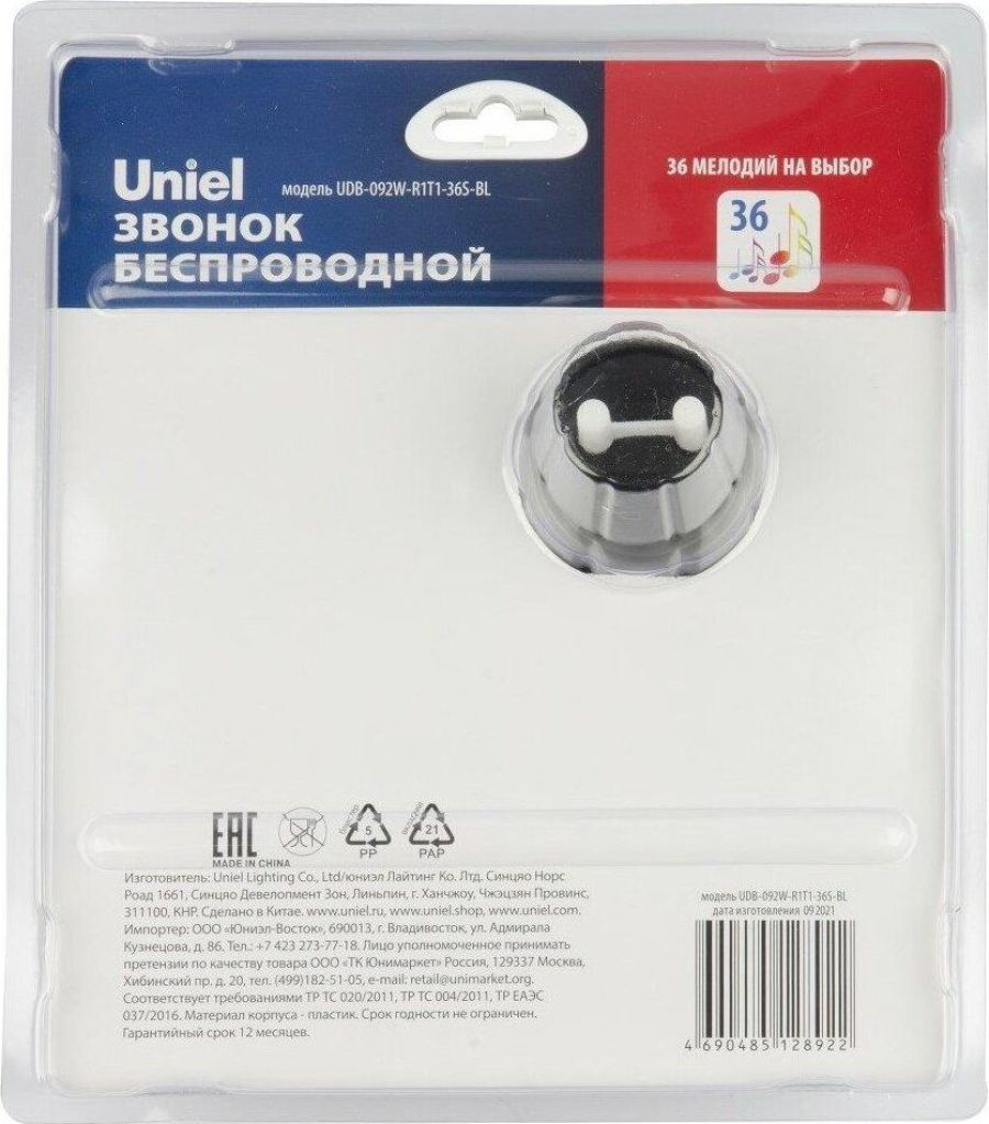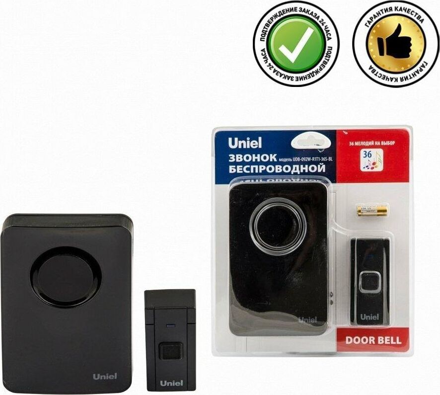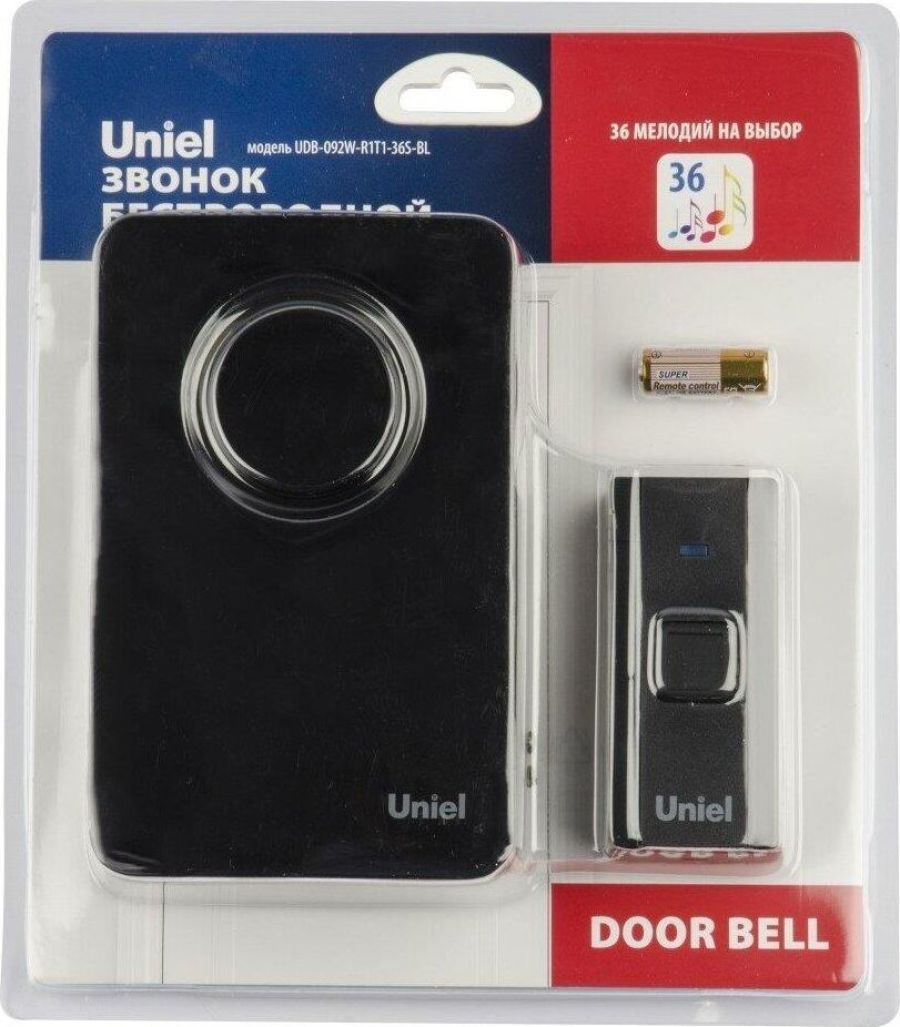 Группа эффективности - Оборотный товар; Количество мелодий, шт. - 36; Материал корпуса (изделия) - пластик; Минимальная партия - 1; Радиус действия, м - 100; Страна производства - Китай; Цвет корпуса (изделия) - черный