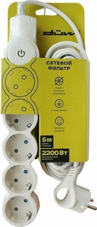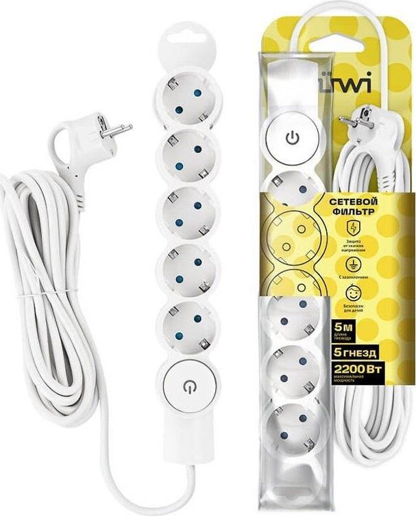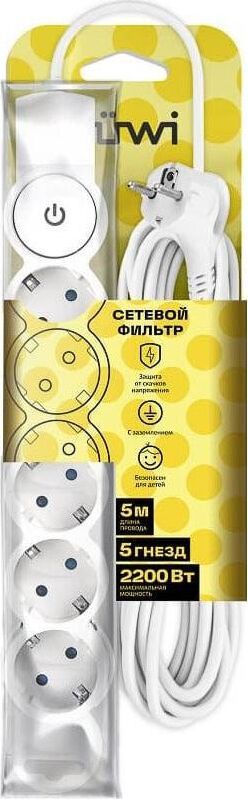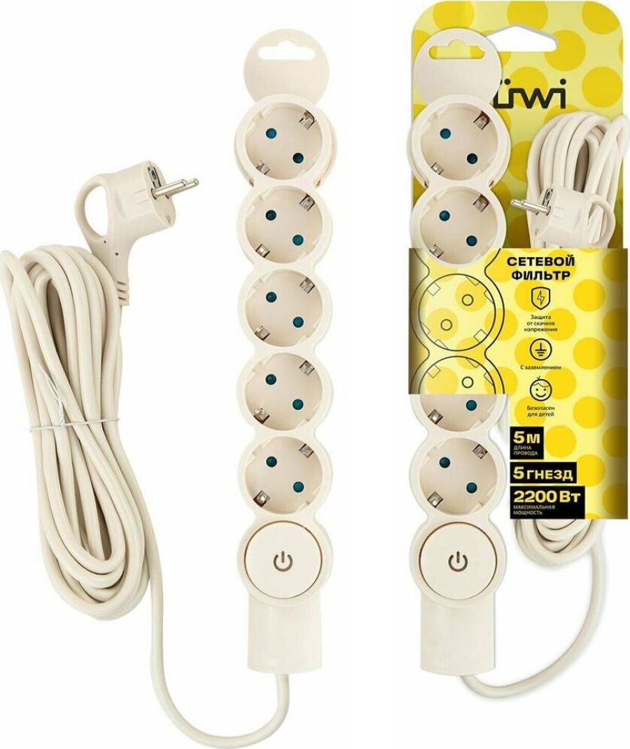 Сетевой фильтр 5 гнезд, с выключателем, с заземлением, 10А/2,2кВт, 5м, слоновая кость